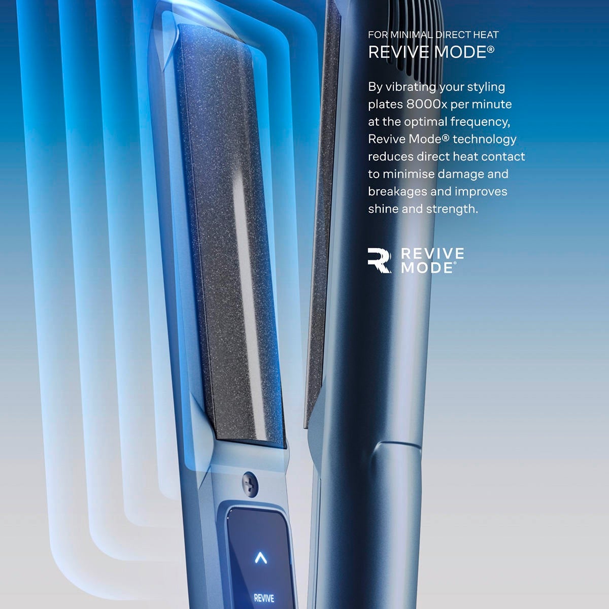 - Für minimalen direkten Kontakt mit Hitze – Revive Mode®: Durch das Vibrieren der Stylingplatten mit 8000 Schwingungen pro Minute bei optimaler Frequenz reduziert die Revive Mode®-Technologie den direkten Hitzekontakt, minimiert Schäden und Haarbruch und verbessert Glanz und Festigkeit.