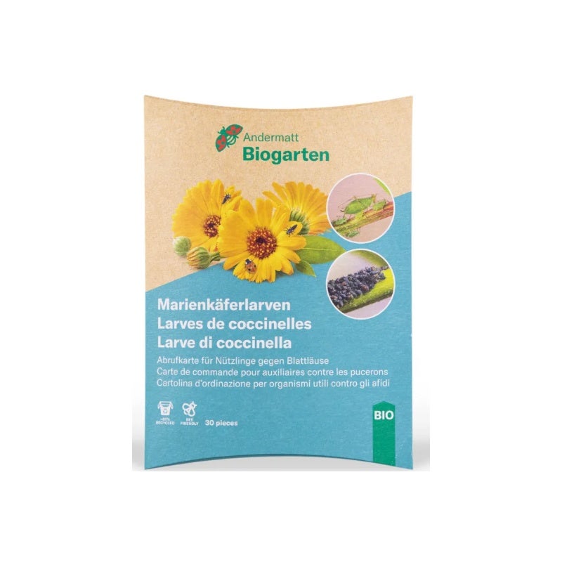 Marienkäferlarven des einheimischen Zweipunkt-Marienkäfers (Adalia bipunctata) sind eine natürliche und wirkungsvolle Hilfe gegen Blattläuse im Garten. Blattläuse schwächen Pflanzen erheblich, indem sie ihnen Nährstoffe entziehen, und ihr ausgeschiedener Honigtau begünstigt zusätzlich die Entwicklung von Pilzkrankheiten. Die Larven des Marienkäfers sind besonders gefrässig und können pro Tag über 100 Blattläuse aufnehmen. Sie entwickeln sich im Verlauf der Saison zu adulten Marienkäfern, die wiederum Eier legen und die natürliche Population fördern.