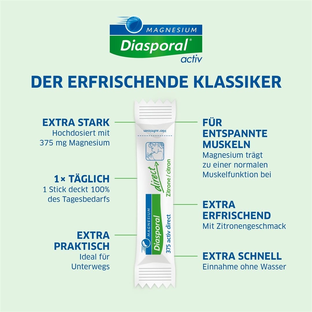 Direktgranulat mit Magnesiumcitrat, wie es als Baustein im Körper vorkommt. Schnell. Stark. Direkt. Ideal für Aktive und beim Sport. Magnesium-Diasporal activ Direct Sticks enthalten 375 mg Magnesium pro Stick.