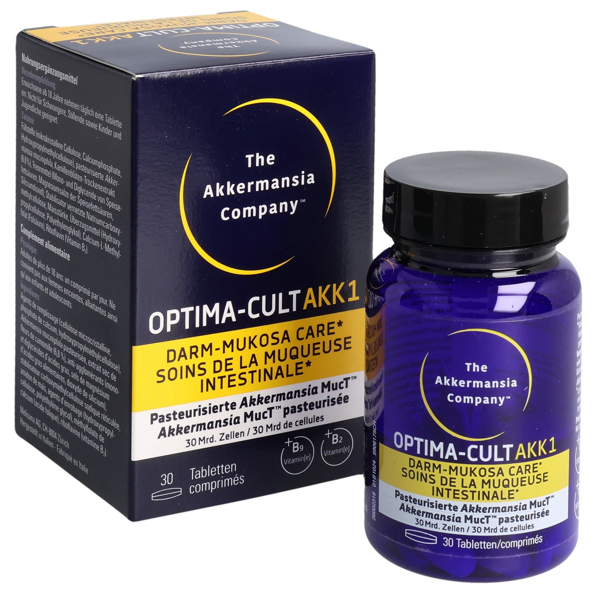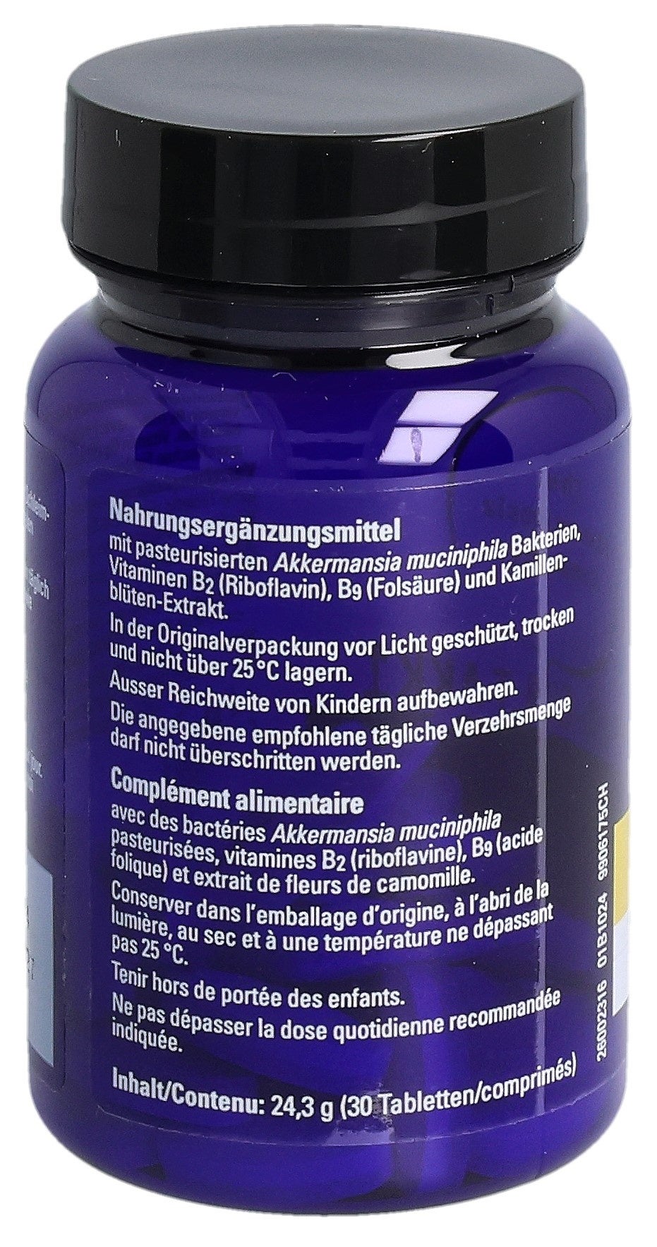 Füllstoffe (mikrokristalline Cellulose, Calciumphosphate, Hydroxypropylmethylcellulose), pasteurisierte Akkermansia muciniphila, Kamillenblüten-Trockenextrakt (6.8%), Trennmittel (Mono- und Diglyceride von Speisefettsäuren, Magnesiumsalze der Speisefettsäuren, Siliciumdioxid), Stabilisator vernetzte Natriumcarboxymethylcellulose, Maisstärke, Überzugsmittel (Hydroxypropylcellulose, Polyethylenglykol), Calcium-L-Methylfolat (Folsäure), Riboflavin (Vitamin B2).