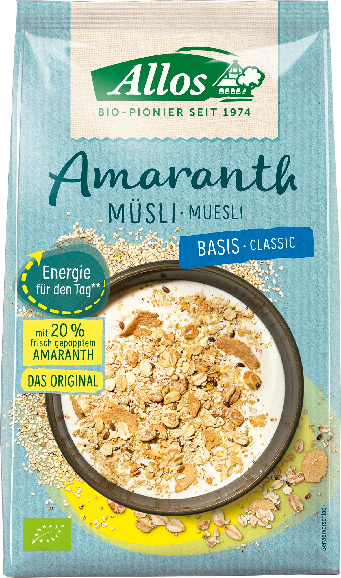 HAFERVOLLKORNFLOCKEN*, Amaranthvollkorn* gepoppt 20%, Hirsevollkornflocken*, Bienenhonig*, Leinsaat*, SESAM*, DINKELVOLLKORN* gepoppt, Amaranthcornflakes* (Mais* gemahlen, Amaranth* gemahlen, Bienenhonig*, Glukosesirup aus Mais*, Meersalz), Buchweizen*,.