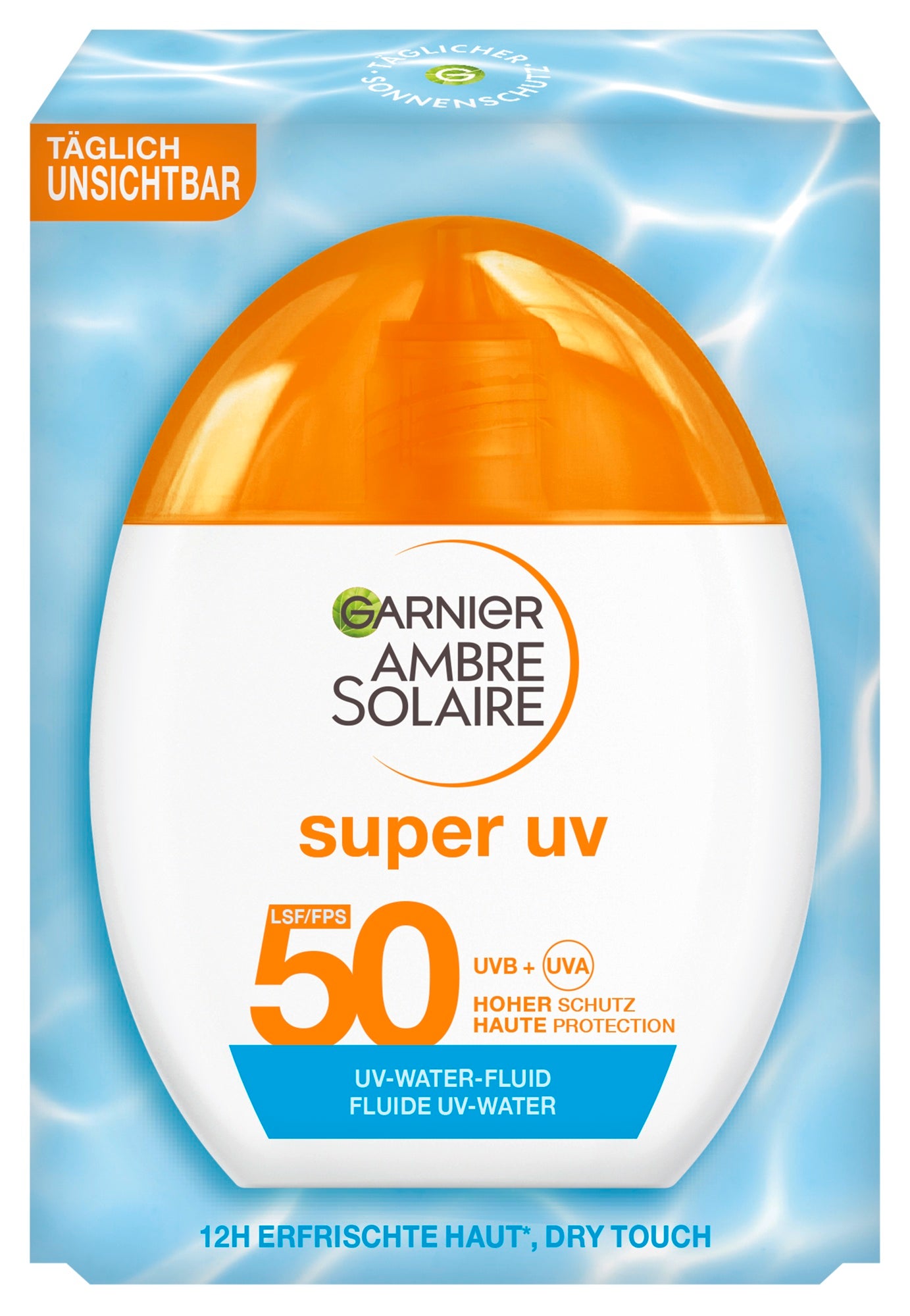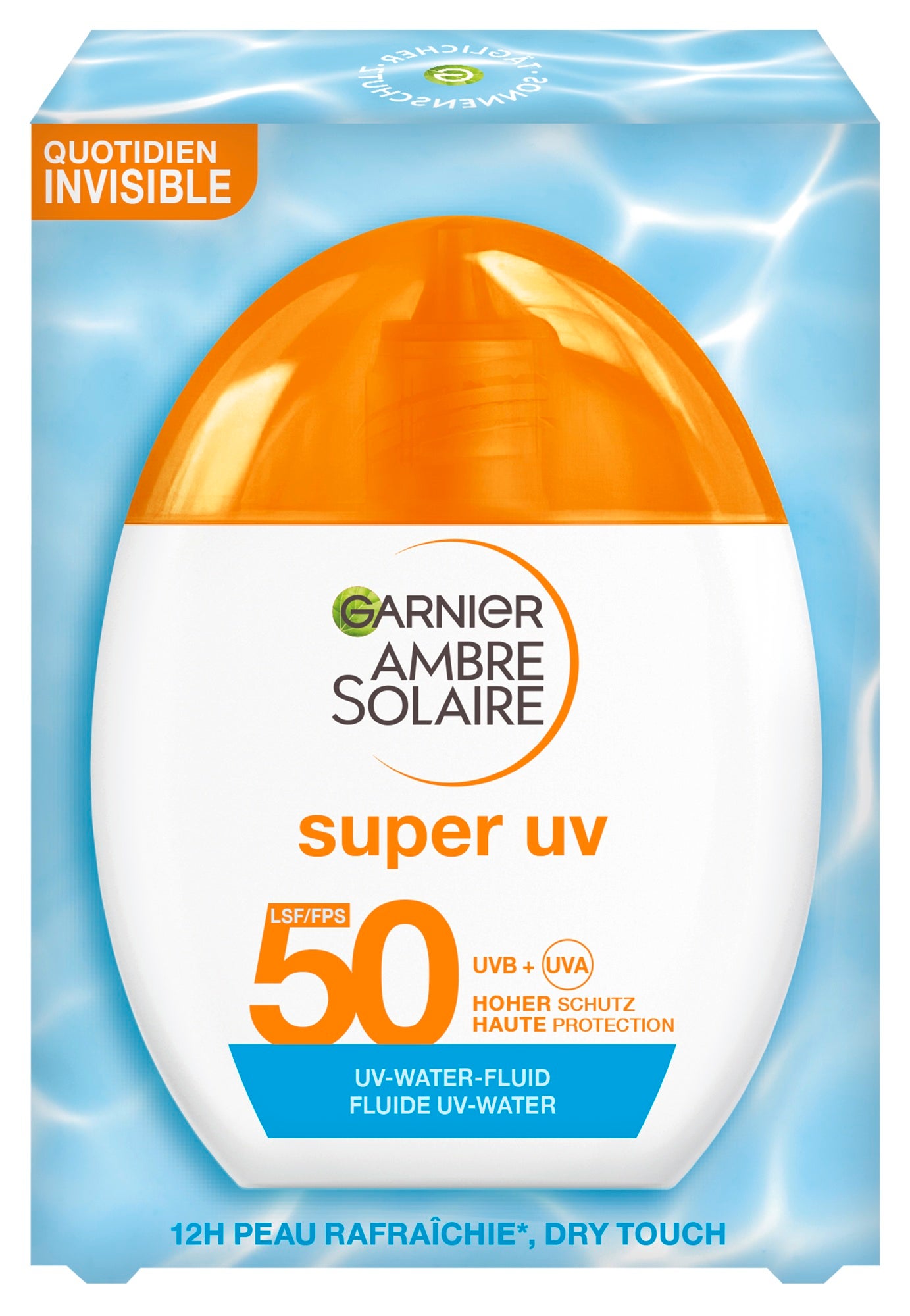 Das super UV UV-Water-Fluid LSF 50 von Garnier Ambre Solaire bietet der Gesichtshaut einen hohen Schutz vor den Auswirkungen der UVA- und UVB-Strahlung. Die Dry-Touch-Formulierung sorgt dabei für 12 Stunden erfrischte Haut, ohne dabei zu kleben oder zu fetten. Dabei eignet sich der Sonnenschutz für eine tägliche Anwendung als Abschluss der Hautpflegeroutine am Morgen, wobei das transparente Fluid ein unsichtbares Finish hinterlässt und damit auch optimal unter Make-up angewendet werden kann.