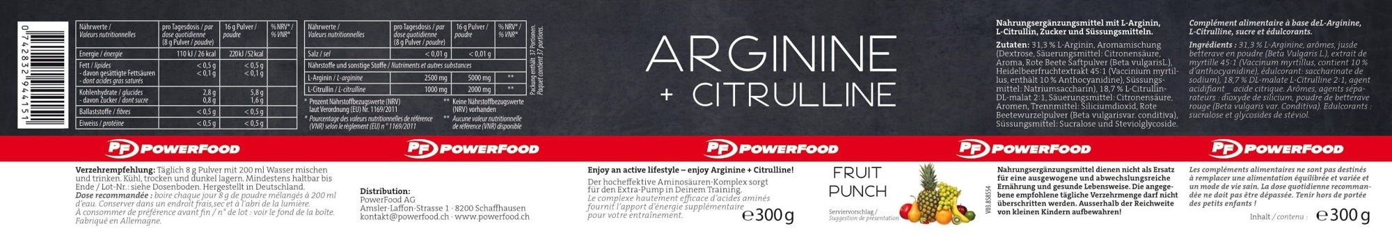 Fruit Punch: 37,7% L-Arginin-Hydrochlorid, Aromamischung (Geschmack Sauerkirsche), 18,7% L-Citrullin-DL-malat 2:1, D-Ribose, Aromen, Orangenfruchsaftpulver (Citrus sinensis L), Säuerungsmittel: Citronensäure, Rote Beetewurzelpulver (Beta vulgaris var. conditiva), Süssungsmittel: Sucralose und Stevioglycoside.