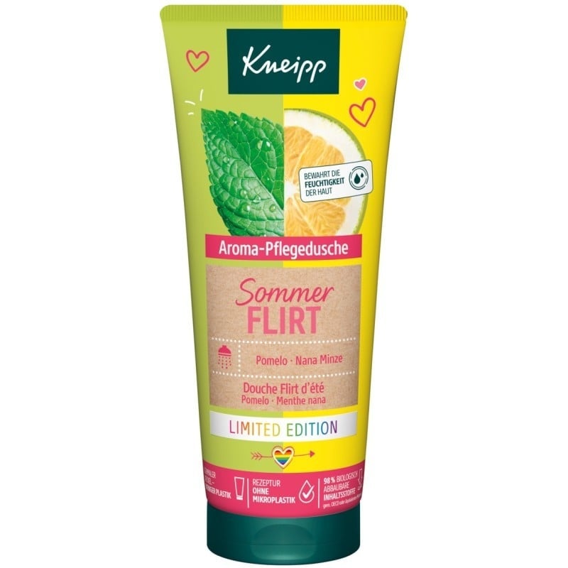 Die Limited Edition Kneipp® Aroma-Pflegedusche Sommerflirt zaubert uns dieses gewisse Lächeln ins Gesicht. Ein unbeschwert frisch-fruchtiger Duft und wertvolle Extrakte aus Pomelo und Nana Minze bringen Glücksmomente in jede Dusche. Genieße Dein Date mit dem Sommer.