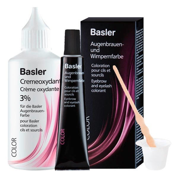 basler Augenbrauen- und Wimpernfarbe inklusive basler Cremeoxydant 3 % als Set. Augenbrauen- und Wimpernfarbe: Für eine dauerhafte und wasserfeste Färbung mit 100%iger Deckkraft. Eine Tube reicht für ca. 30 Anwendungen, inklusive Farbnäpfchen und Auftragestäbchen. Gebrauchsanweisung und Warnhinweis bitte genau beachten. Wimpernblättchen bitte extra dazu bestellen! Inhalt 15 ml. Cremeoxydant 3 %: Entwicklerflüssigkeit auf Cremebasis. 3% H