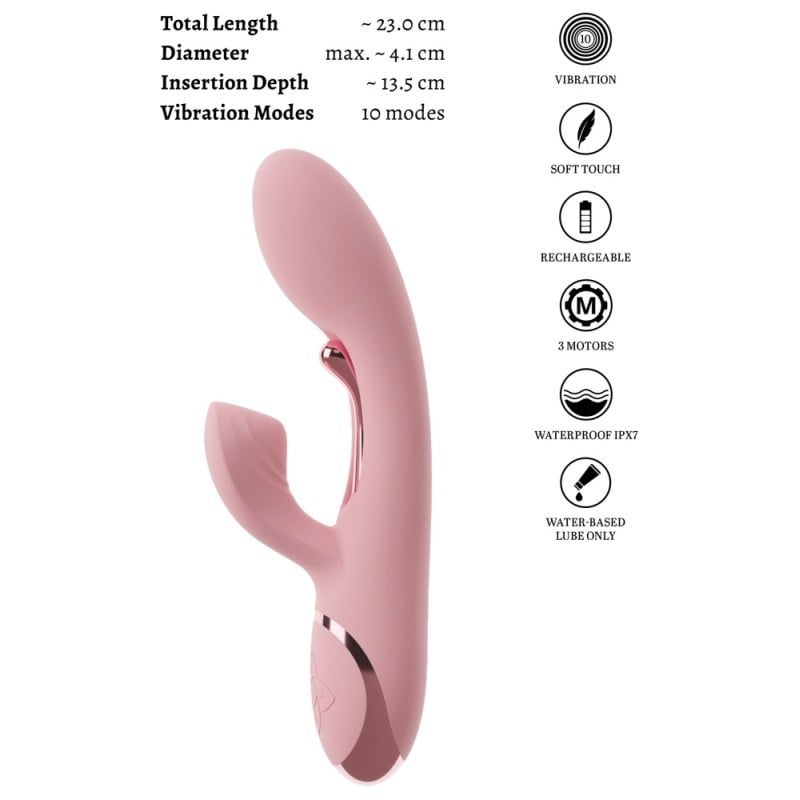 Der leise Lustpunkt-Profi! Der elegante AVENOR G-Spot Rabbit with vibrating metal tongue von beau cœur verwöhnt mit seinen 3 leistungsstarken Motoren Vagina, G-Zone und Klitoris zugleich. Ganz leise (47dB) und sehr diskret! Der Silikonvibrator überrascht dabei mit der innovativen Vibro-Zunge aus Metall für durchdringende G-Zonen-Impulse. Dazu verstärken kraftvolle Vibrationen in der Schaftspitze den tiefgehenden Vagina-Spaß. Zusätzlich genießt die Klitoris eine prickelnde Hotspot-Massage. Da sind neue intensive Höhepunkte vorprogrammiert! Durch die gezielte Stimulation der G-Zone kann zudem das Erleben von Squirting erleichtert werden.