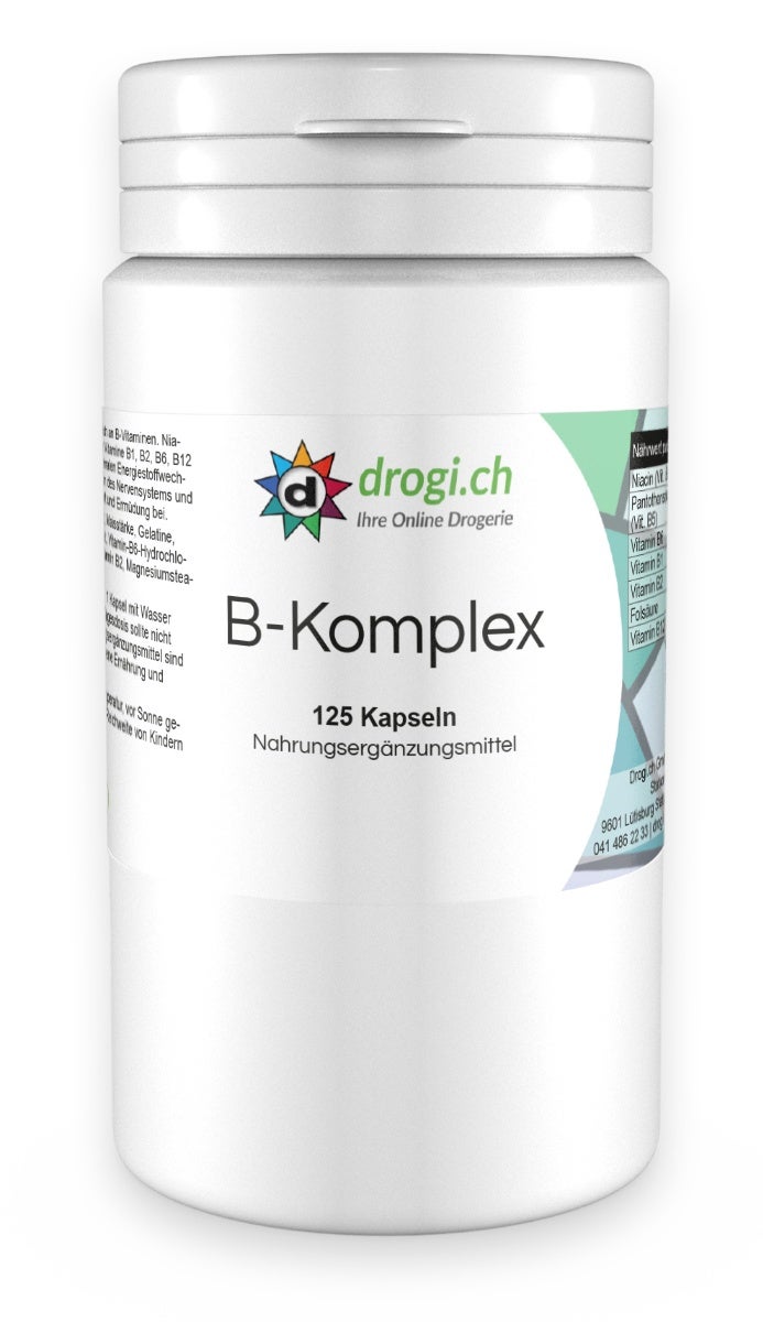drogi B-Komplex Kapseln. Nahrungsergänzungsmittel reich an B-Vitaminen.