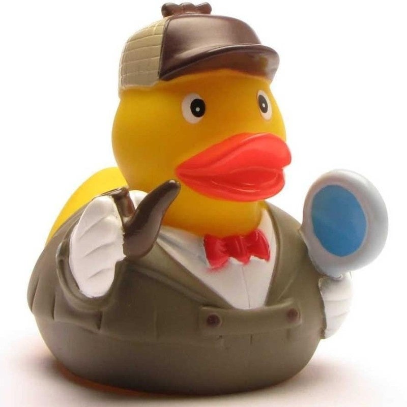 Auf Spurensuche in der Badewanne! Die LiLaLu Badeente im Stil des berühmten Meisterdetektivs Sherlock Holmes bringt einen Hauch von Londoner Krimi-Flair ins Badezimmer. Mit Deerstalker-Mütze, Pfeife und klassischem Mantel ist sie bereit, jedes Rätsel zu lösen – sogar im Schaumbad.