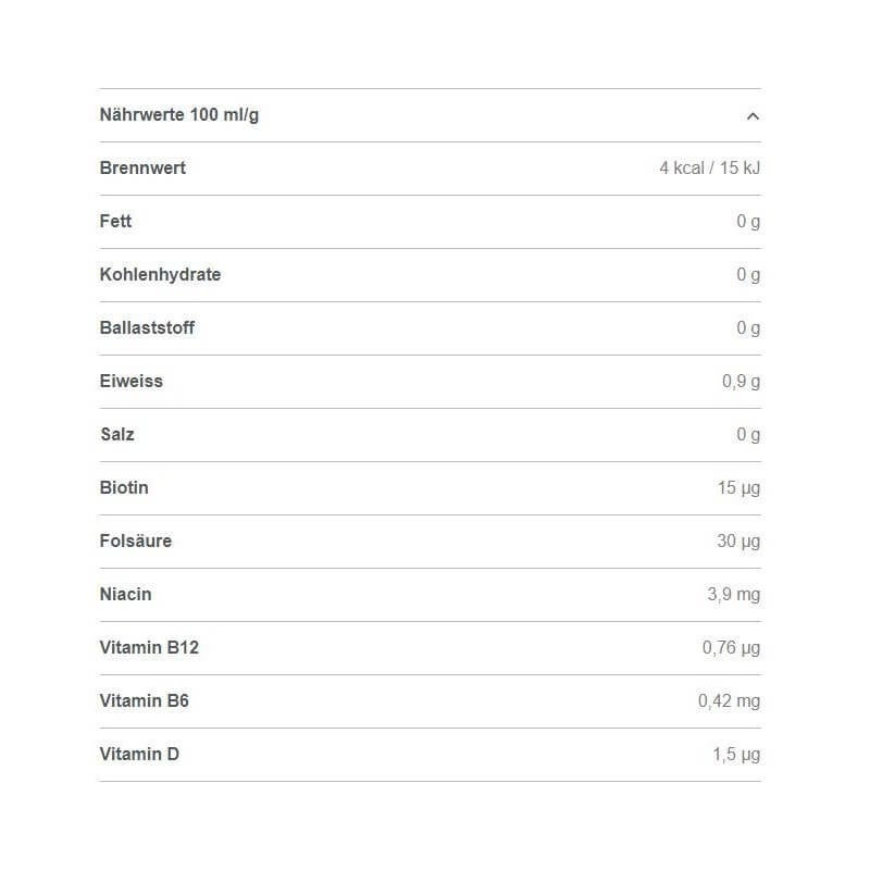 Wasser, Kohlensäure, verzweigkettige Aminosäuren BCAA (L-Leucin, L-Valin, L-Isoleucin), L-Carnitin L-Tartrat, Koffein, Grüntee-Extrakt, Vitamine (Niacin, Vitamin B6, Folsäure, Biotin, Vitamin D, Vitamin B12), säureregelnde Mittel (Zitronensäure, Natriumcitrat), Aroma (Birne und Pfirsich), Süssstoff (Sucralose), Farbstoff (Betacarotene).