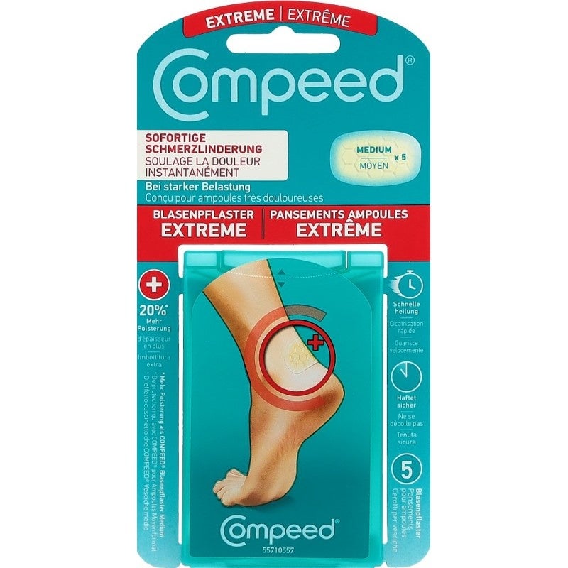 Die Compeed Blasenpflaster Extreme wurden speziell für besonders grosse und schmerzhafte Blasen entwickelt – wie sie häufig bei Sport, Wandern oder starker Belastung entstehen. Dank der hochentwickelten Hydrokolloid-Technologie sorgen sie für sofortige Schmerzlinderung und unterstützen eine beschleunigte Wundheilung. Die innovative Wabenstruktur bietet 20 % mehr Polsterung und schützt zuverlässig vor Druck und Reibung, selbst bei intensiver Bewegung. Das im Pflaster enthaltene aktive Gel absorbiert überschüssige Feuchtigkeit, bildet ein optimales Heilungsmilieu und lenkt den Druck gezielt von der Blase weg. Durch die abgeschrägten Ränder passen sich die Pflaster perfekt an die Hautoberfläche an. Dadurch wird schmerzhafte Reibung reduziert und die Wunde kann ungestört abheilen. Die Pflaster haften sicher über mehrere Tage (individuell unterschiedlich) und bleiben auch bei hoher Belastung zuverlässig an Ort und Stelle.
