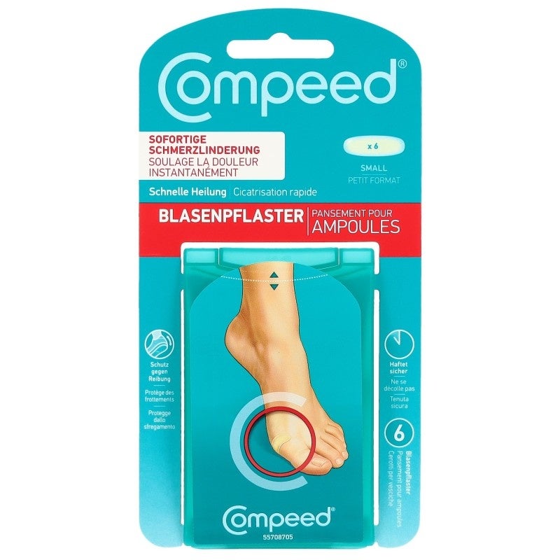 Die Compeed Blasenpflaster Small wurden speziell für kleinere Blasen an den Füssen entwickelt. Sie nehmen überschüssige Wundflüssigkeit auf, bilden ein schützendes Polster und sorgen für sofortige Schmerzlinderung. Gleichzeitig schaffen sie eine ideale, feuchte Heilumgebung, die die natürliche Wundheilung unterstützt. Dank der bewährten Hydrokolloid-Technologie enthalten die Pflaster ein aktives Gel, das Feuchtigkeit absorbiert und den Druck gezielt von der Blase weglenkt. Die dicke Polsterung reduziert schmerzhafte Reibung und schützt die betroffene Stelle zuverlässig – auch bei Bewegung. Die abgeschrägten Ränder sorgen dafür, dass sich das Pflaster perfekt an die Hautoberfläche anschmiegt und den Bewegungen des Fusses anpasst. So haftet es sicher über mehrere Tage (individuell unterschiedlich), während die Blase ungestört abheilen kann. Das wasserdichte und zugleich atmungsaktive Design bewahrt die natürliche Feuchtigkeit der Haut und schützt vor Keimen, Schmutz und Wasser.