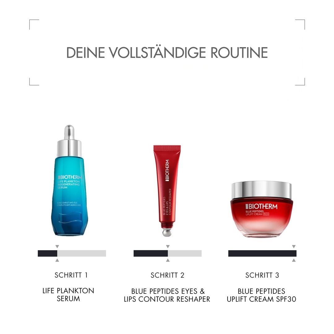 Entdecke das Geheimnis einer sichtbar strafferen Haut und eines strahlenden Aussehens mit der Blue Peptides Uplift Cream SPF 30 von Biotherm - eine Creme der neuen Blue Peptides-Reihe. Die Formulierung basiert auf den neuesten biowissenschaftlichen Erkenntnissen und kombiniert Life Plankton mit Kollagenpeptiden, um die Kollagensynthese zu stimulieren. Ein hoher Kollagengehalt gibt der Haut die strukturelle Unterstützung, die sie braucht, straffer auszusehen. Der hohe Lichtschutzfaktor schützt Ihre Haut vor den Alterungseffekten der schädlichen UV-Strahlen der Sonne. Die Blue Peptides Uplift SPF 30 sorgt für ein rosiges Hautbild und einen strahlenden Glow. Anwendung: Die Blue Peptides Uplift SPF 30 Creme für ein optimales Ergebnis jeden Morgen auf das gereinigte Gesicht und den Hals auftragen. Eine kleine Menge der Gesichtscreme nehmen und zwischen den Handflächen erwärmen. Die Gesichtscreme für eine gründliche Durchfeuchtung gleichmäßig auf Wangen, Stirn und Kinn auftragen. Die Creme mit den Fingerspitzen entlang der Kieferpartie bis hinunter zum Hals streichen, um dessen Straffheit zu verbessern. Von den Lippenwinkeln zu den äußeren Augenwinkeln und dann von den Augenbrauen zum Scheitel streichen. In der Mitte des Gesichts beginnen, die Finger nach außen drücken und vom Kiefer zur Stirn bewegen.