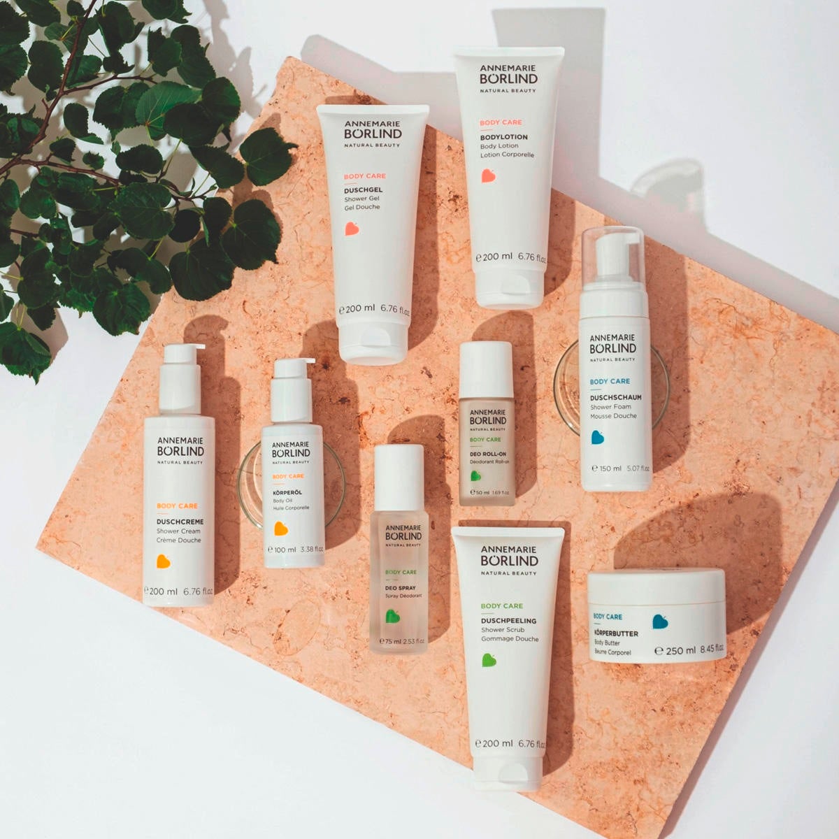 Die BODY CARE Linie ist ganz auf Nach­haltig­keit ausge­richtet. Börlind verwenden Kunst­stoff­behält­nisse aus nach­wachsenden Roh­stoffen (z. B. Zucker­rohr aus verantw­ortungs­vollem Anbau) und setzen Recycling-Materialien ein – auf dem neuesten Stand der Technik und im Ein­klang mit unserem Qualitäts­anspruch.