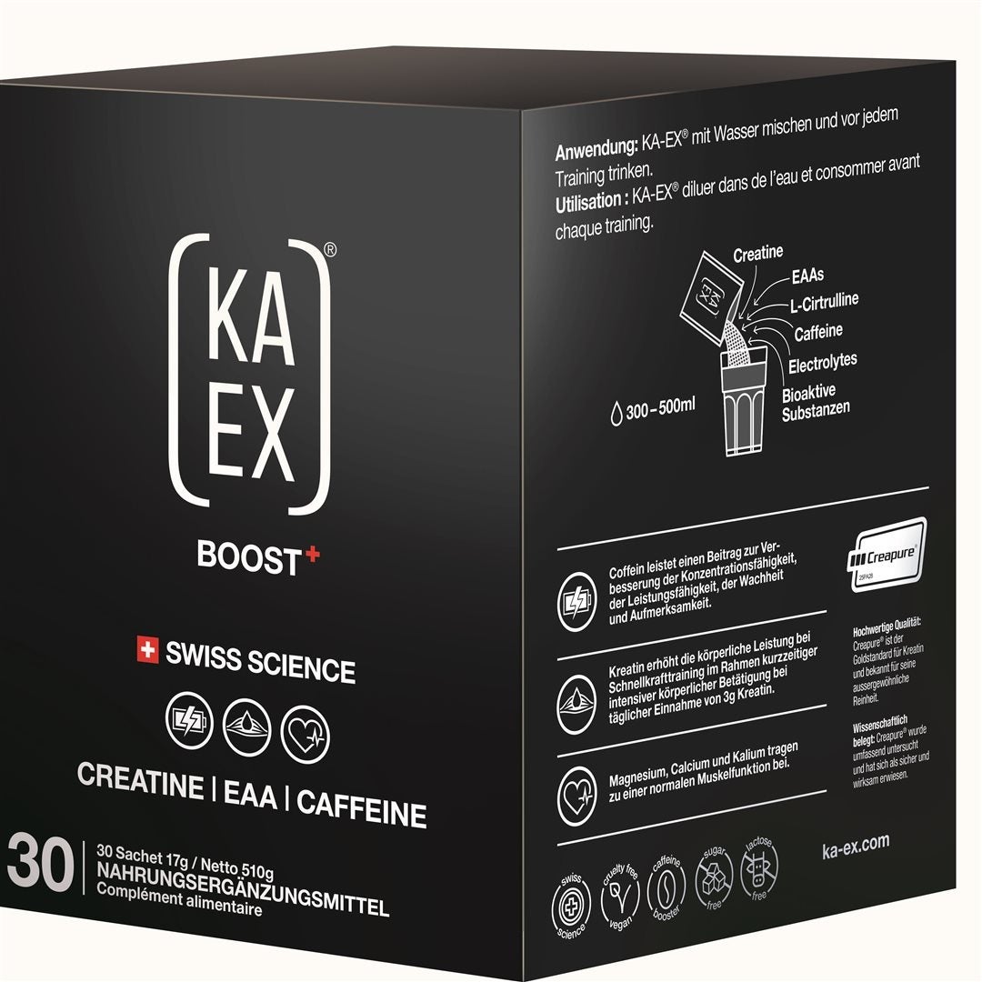 KA-EX BOOST ist eine leistungssteigernde Kombination aus Creatin (Creapure®), essentiellen Aminosäuren (EAA), Koffein, L-Citrullin, bioaktiven Substanzen, Betaine und Elektrolyten. Entwickelt in der Schweiz, unterstützt die Formel gezielt die körperliche Leistungsfähigkeit, Muskelkraft und Ausdauer vor und während intensiven Trainingseinheiten.