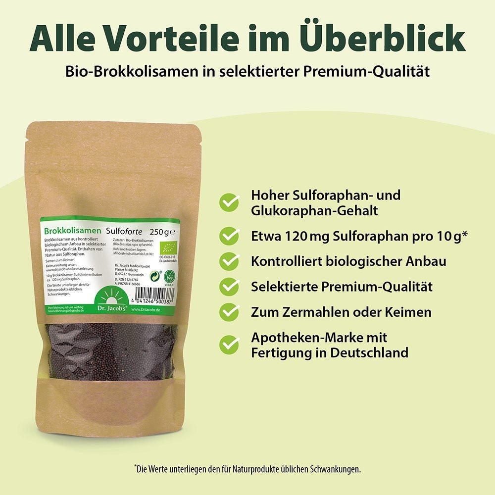 Bio-Brokkolisamen in selektierter Premium-Qualität, besonders hoher Sulforaphan- und Glukoraphan-Gehalt, für das Keimen von Brokkolisprossen geeignet