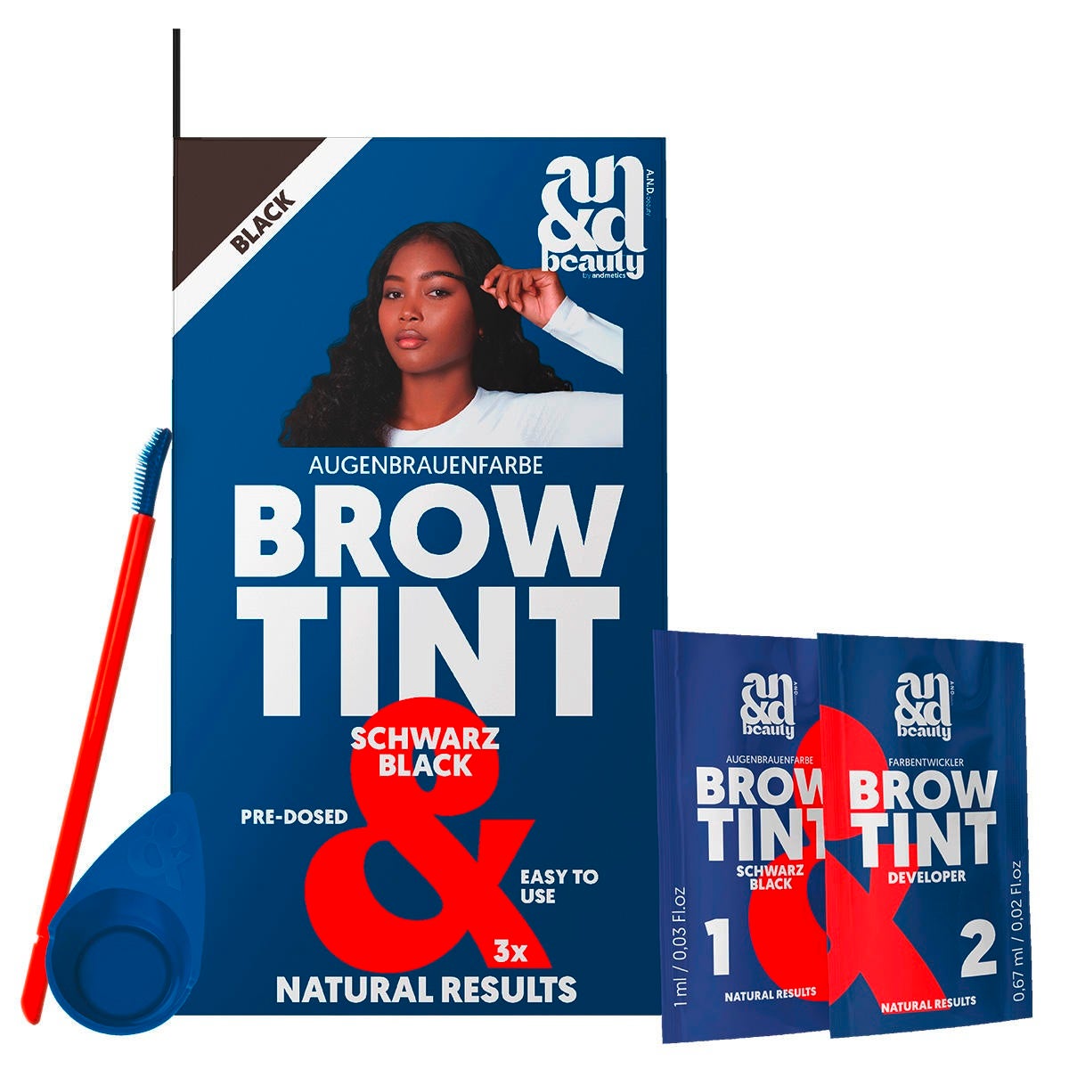 Die A.N.D. beauty Brow Tints verleihen deinen Augenbrauen in wenigen Minuten sichtbar mehr Tiefe, Farbe und Definition. Die cremige Formel ist einfach vordosiert, lässt sich einfach auftragen, hält bis zu 4 Wochen und passt zu allen Haartypen und Hauttönen. 4 supernatürliche Shades – ohne Rotstich: dunkelblond / hellbraun / dunkelbraun / schwarz. Anwendung: Farbcreme und Entwickler mischen. Auf gereinigte Brauen auftragen. 5–10 Minuten einwirken lassen. Mit feuchtem Wattepad abnehmen.