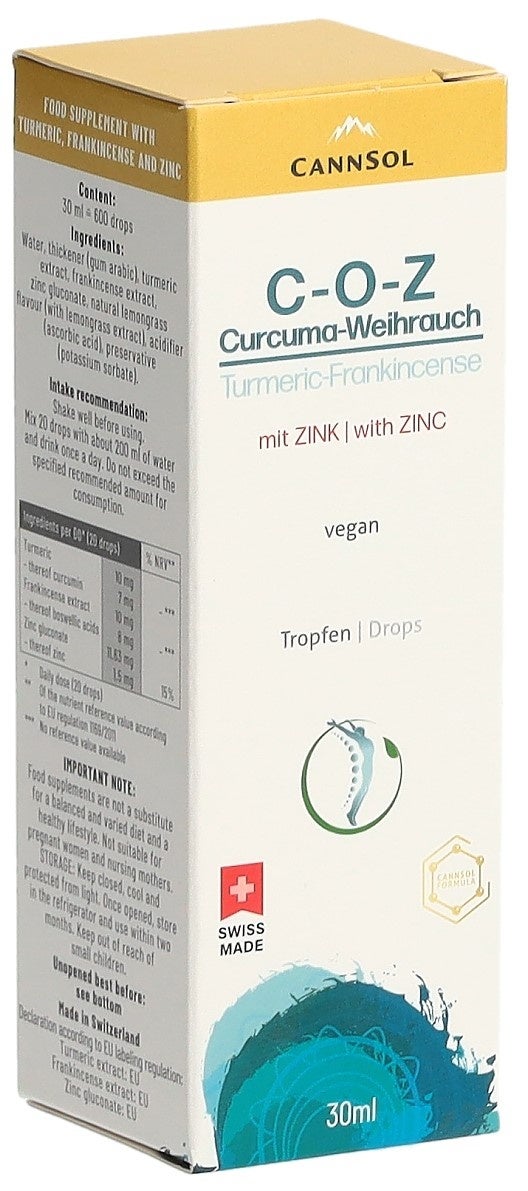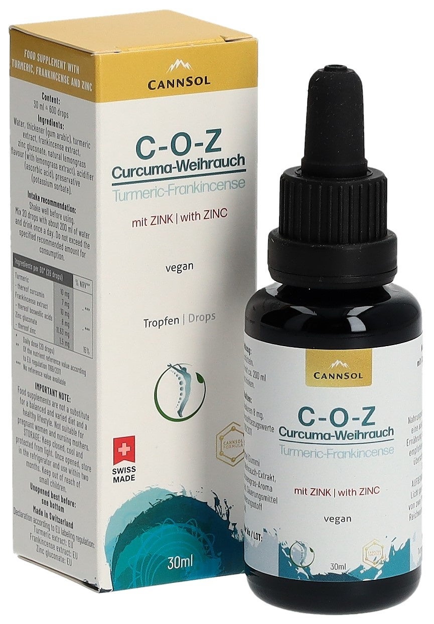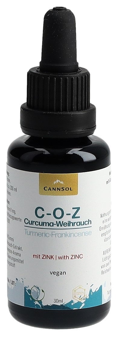 Das CannSol C-O-Z ist ein innovatives Nahrungsergänzungsmittel, das die Vorteile von Curcuma-Extrakt, Indischem Weihrauch (Boswellia serrata) und Zink vereint. Diese Inhaltsstoffe sind bekannt für ihre natürlichen gesundheitsfördernden Eigenschaften, die insbesondere für die Unterstützung des Immunsystems, der Gelenke und der allgemeinen Vitalität wichtig sind. Mit CannSol C-O-Z erhalten Sie die geballte Kraft der Natur in einem angenehm schmeckenden, veganen Tropfenpräparat.