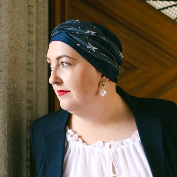 Mit wenigen einfachen Handgriffen entsteht eine stilsichere Kopfbedeckung für Menschen, die ihre Haare durch eine Krankheit verloren haben.