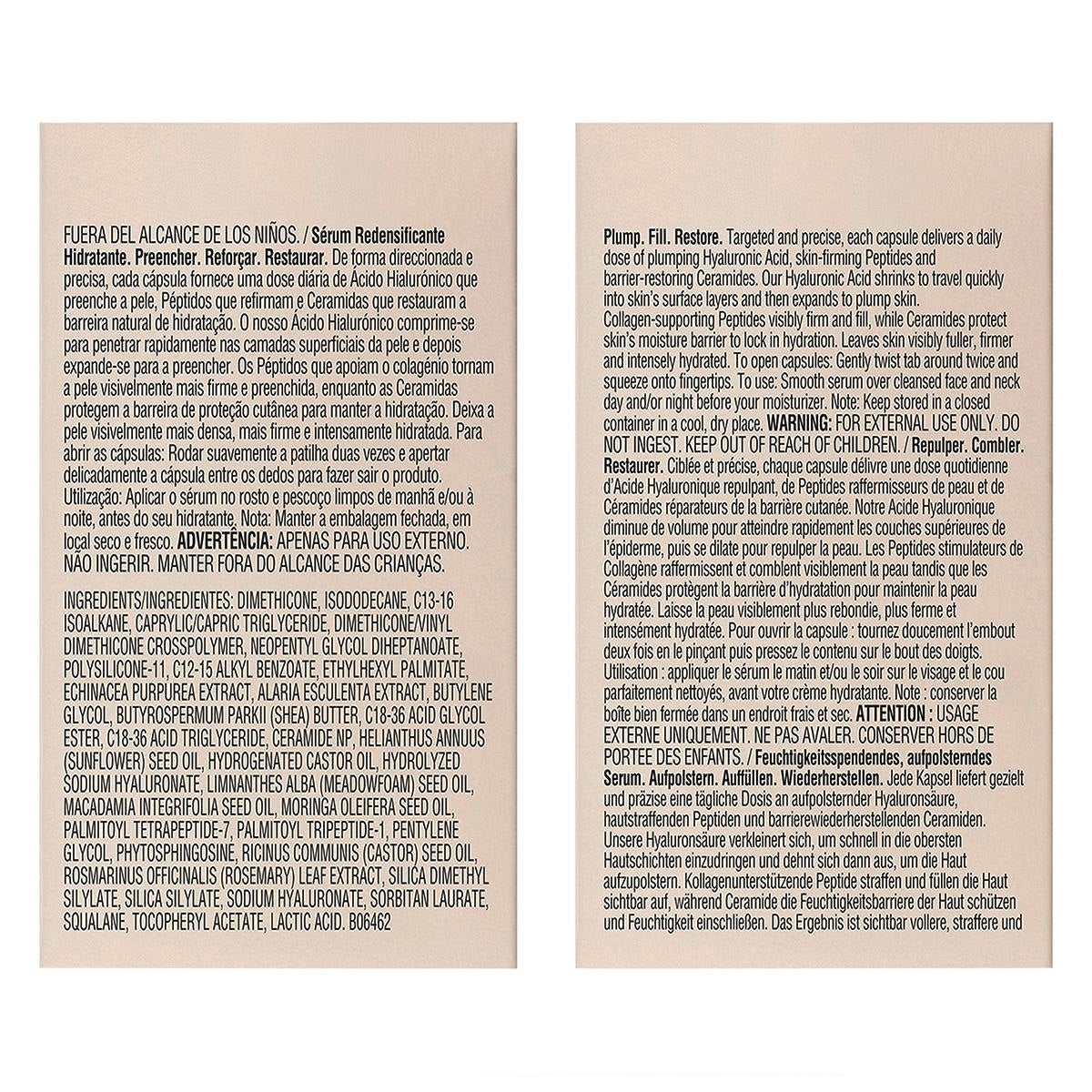 Dimethicone, Isododecane, C13-16 Isoalkane, Caprylic/Capric Triglyceride, Dimethicone/Vinyl Dimethicone Crosspolymer, Neopentyl Glycol Diheptanoate, Polysilicone-11, C12-15 Alkyl Benzoate, Ethylhexyl Palmitate, Echinacea Purpurea Extract, Alaria Esculenta Extract, Butylene Glycol, Butyrospermum Parkii (Shea) Butter, C18-36 Acid Glycol Ester, C18-36 Acid Triglyceride, Ceramide NP, Helianthus Annuus (Sunflower) Seed Oil, Hydrogenated Castor Oil, Hydrolyzed Sodium Hyaluronate, Limnanthes Alba (Meadowfoam) Seed Oil, Macadamia Integrifolia Seed Oil, Moringa Oleifera Seed Oil, Palmitoyl Tetrapeptide-7, Palmitoyl Tripeptide-1, Pentylene Glycol, Phytosphingosine, Ricinus Communis (Castor) Seed Oil, Rosmarinus Officinalis (Rosemary) Leaf Extract, Silica Dimethyl Silylate, Silica Silylate, Sodium Hyaluronate, Sorbitan Laurate, Squalane, Tocopheryl Acetate, Lactic Acid. B06462