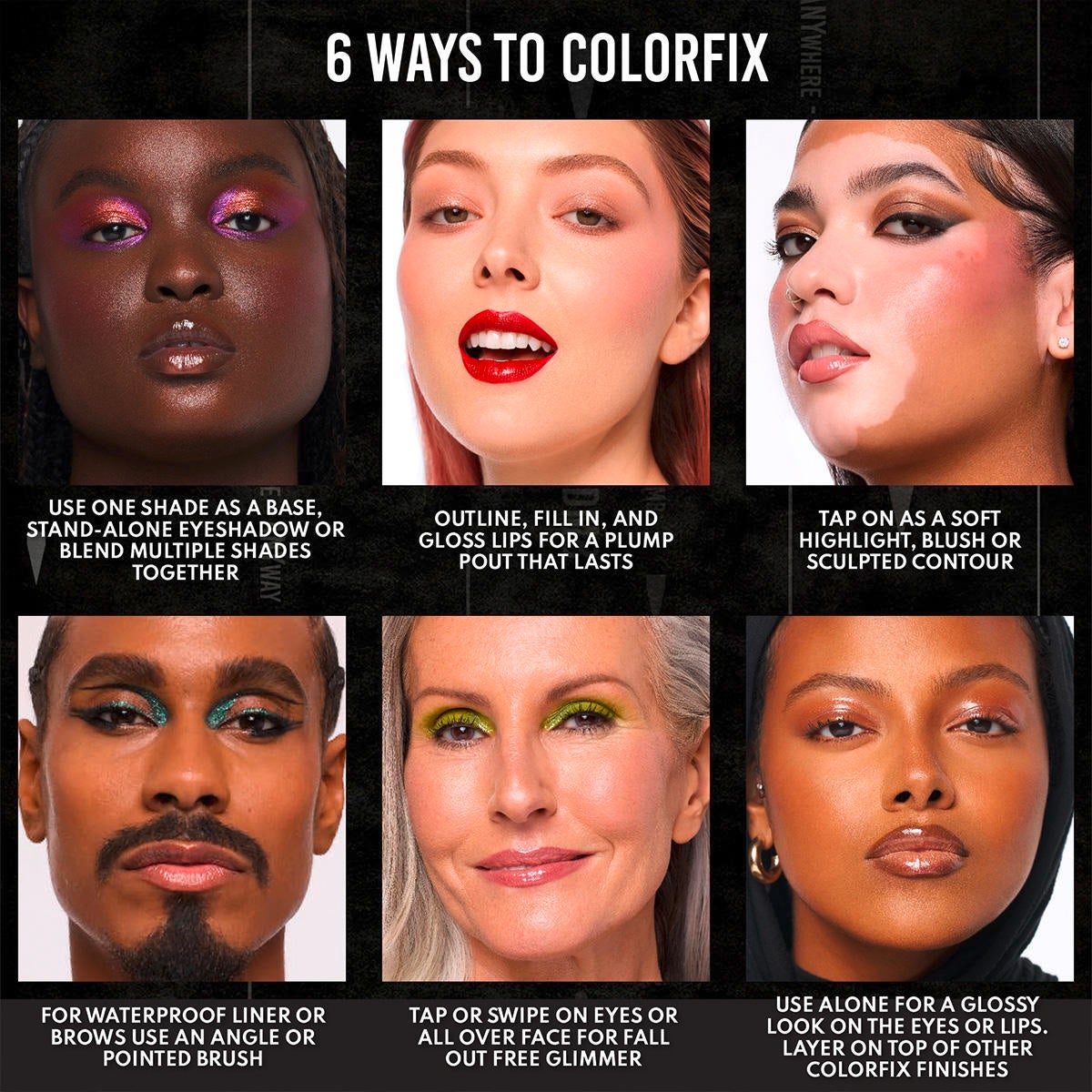 Ein preisgekröntes, vielseitiges, langanhaltendes, wasserfestes Cremepigment, das bis zu 24 Stunden lang als Lidschatten, Lippenstift und Rouge verwendet werden kann. Eine hochpigmentierte, weich-matte Cremefarbe. Colorfix eignet sich perfekt als Basis/Grundierung, als eigenständiger Farbton oder zum Mischen mit anderen Farbtönen/Finishs. Mit der quetschbaren Verpackung und der Präzisionsspitze bietet Colorfix die Freiheit, Farben, Finishs und Looks nach Wunsch zu mischen, zu kombinieren, zu schichten und zu spielen. Es gibt 7 vielseitige, lang anhaltende Finishes. Sie können einzeln verwendet, geschichtet, gemischt und aufeinander abgestimmt werden und in jeder Farbe und Textur verwendet werden. Anwendung: Es gibt unendlich viele Möglichkeiten, mit Colorfix zu spielen! Quetschen. Tupfen. Streichen. Mischen