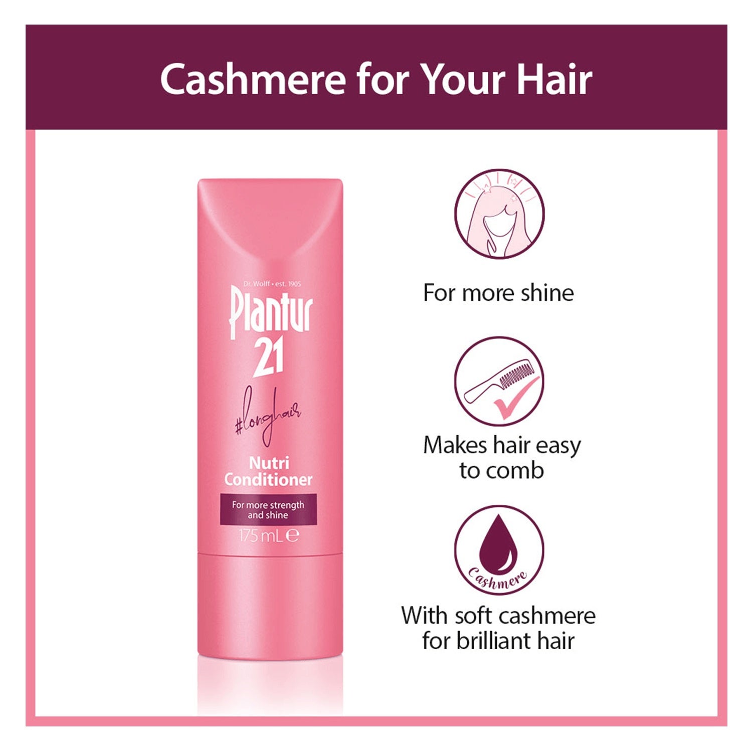 Besonders für langes und kraftvolles Haar ist eine passende Pflegeroutine unerlässlich. Stylen und Färben oder zu viel Hitze durch Föhn und Glätteisen strapazieren das Haar und beschädigen es von aussen. Der silikonfreie Nutri-Conditioner verleiht dem Haar mit Pflegestoffen wie Cashmere wieder Glanz und Geschmeidigkeit, ohne es zu beschweren. Die Kämmbarkeit wird verbessert, da die Struktur der Haare gestärkt und an der Oberfläche geglättet wird. Zusätzlich verhindern das enthaltene Coffein und die Mikronährstoffe ein Herausspülen der vorher über das Nutri-Coffein-Shampoo aufgenommenen Wirkstoffe.