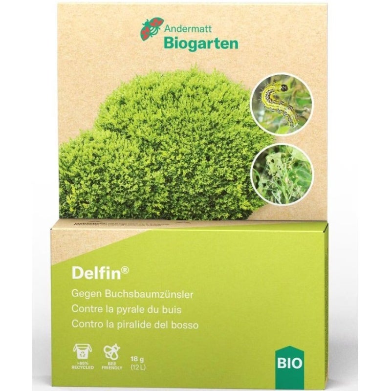 Delfin gegen Buchsbaumzünsler ist ein biologisches Insektizid, das gezielt gegen die Raupen des invasiven Buchsbaumzünslers wirkt. Es bekämpft zuverlässig sowohl kleine als auch grosse Raupen und basiert auf dem natürlich vorkommenden Bakterium Bacillus thuringiensis var. kurstaki. Das Produkt ist nützlingsschonend und kann während der Blütezeit angewendet werden, ohne die Sicherheit von Bienen und anderen bestäubenden Insekten zu beeinträchtigen.