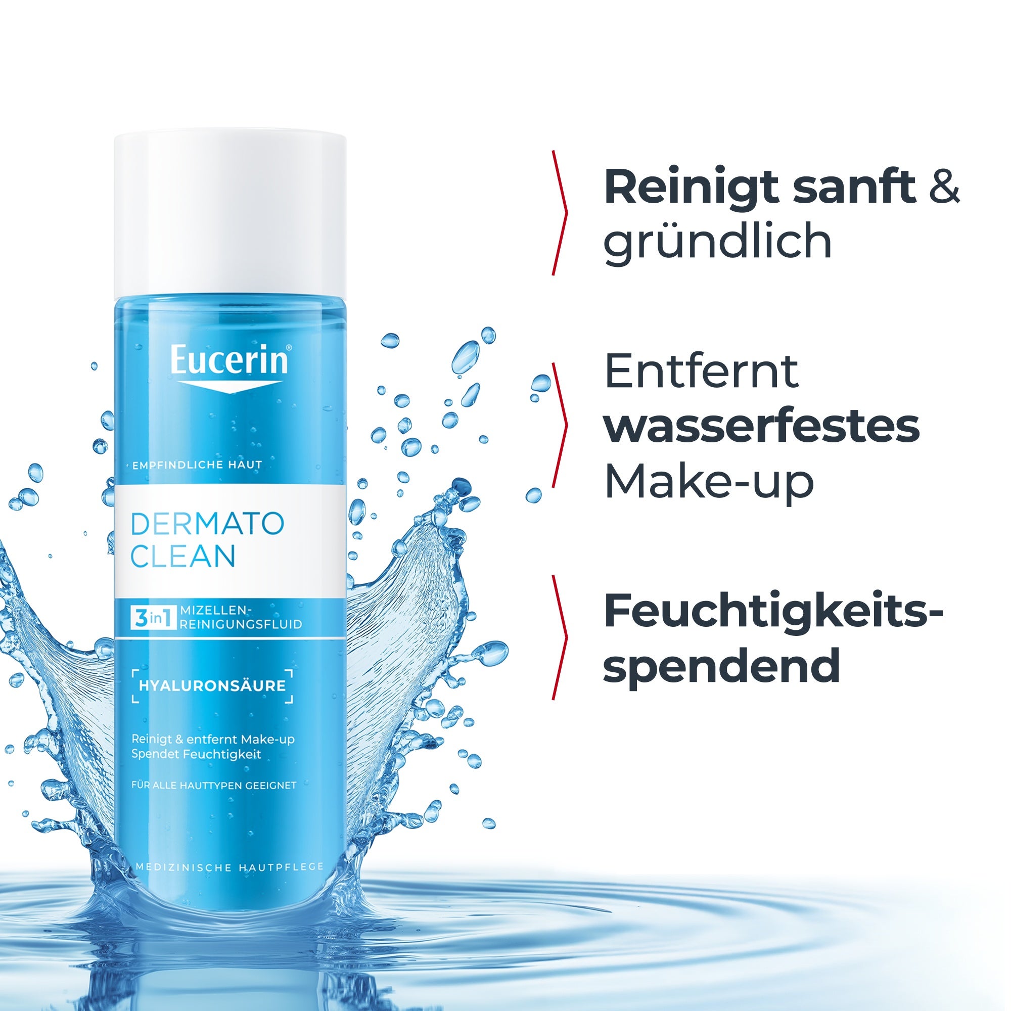 Eucerin DermatoCLEAN [HYALURON] 3in1 Mizellen Wasser ist eine sanfte, aber gründliche Gesichtsreinigung, die Schmutzpartikel sowie Gesichts- und Augen-Make-up entfernt und die Haut vor dem Austrocknen bewahrt.
