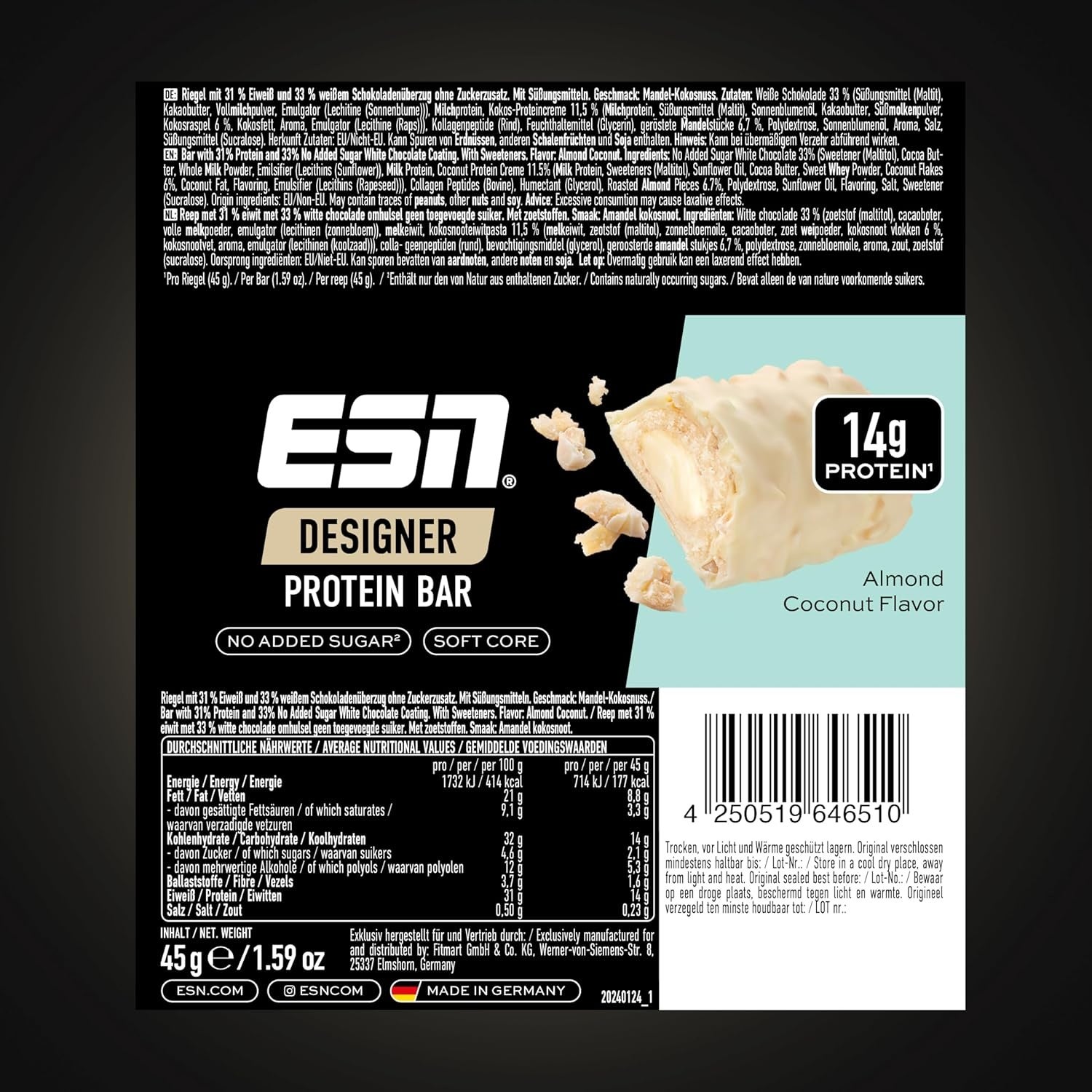 Coconut: Proteinmischung (Milchproteinisolat, Molkenproteinisolat), Süßungsmittel (Maltit), Feuchthaltemittel (pflanzliches Glycerin), lösliche Maisfaser, Kollagenpeptide, Kakaobutter, Vollmilchpulver, Kakaomasse, Kokosflocken (2,25%), Palmfett, Kakaopulver, Kartoffelstärke, Salz, Emulgator (Soja-Lecithin), Aromen, Süßungsmittel (Sucralose).