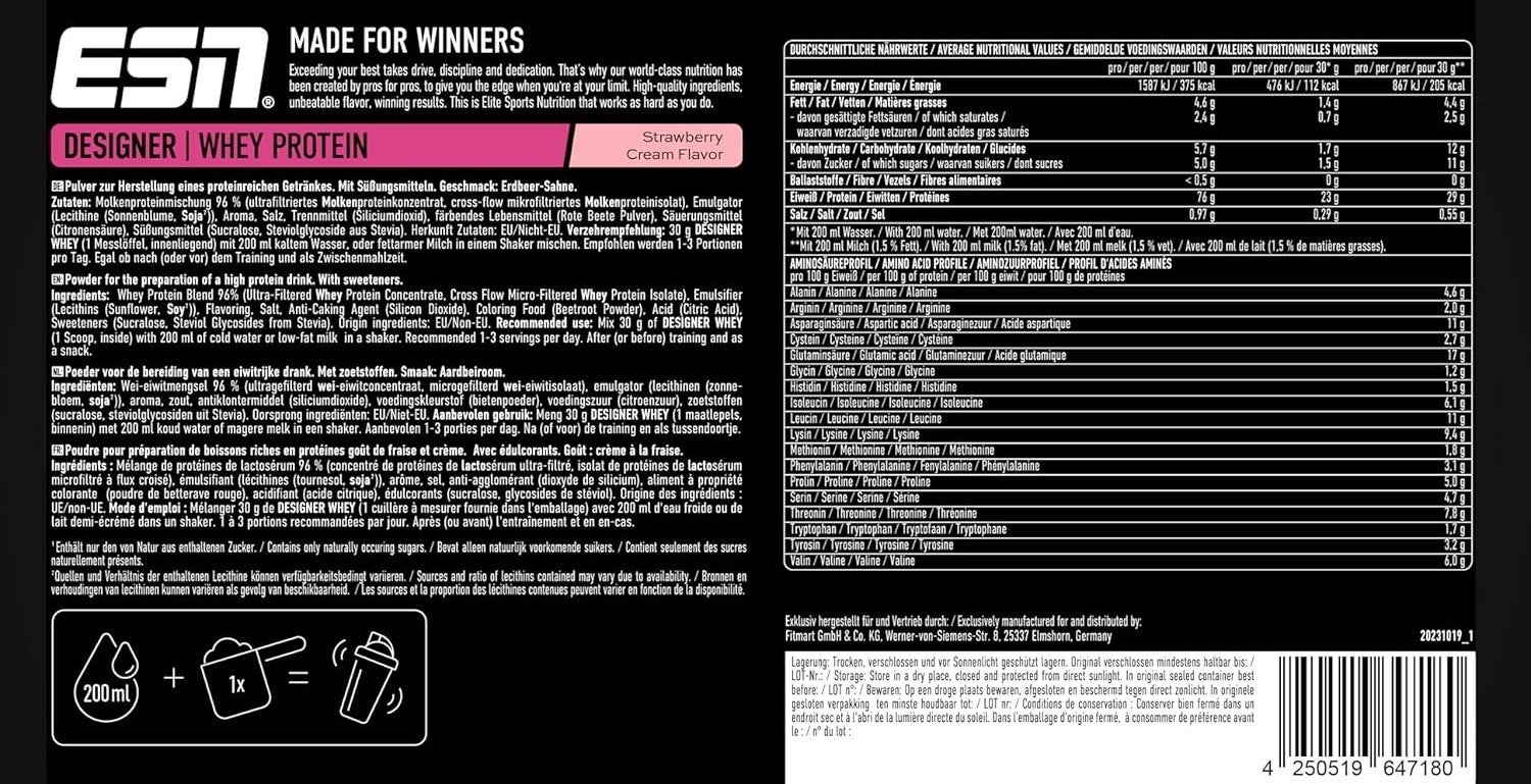 Strawberry Cream: Molkenproteinmischung (ultrafiltriertes Molkenproteinkonzentrat, crossflow mikrofiltriertes Molkenproteinisolat), Aroma, Salz, Emulgator (Lecithine (Sonnenblume, Raps, Soja)*), Säuerungsmittel (Citronensäure), färbendes Lebensmittel (Rote Beete Pulver), Süßungsmittel (Sucralose, Steviolglycosideaus Stevia).