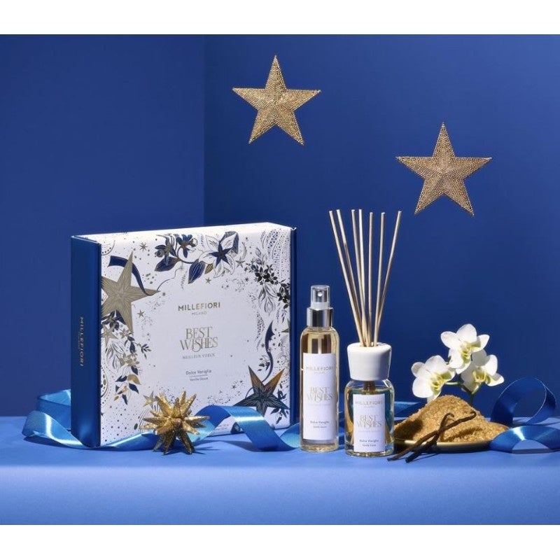 LIMITED EDITION Premium Weihnachtsgeschenkset bestehend aus einem Duftstäbchen Diffuser 100 ml und einem Homespray mit den Duft Dolce Vaniglia. Das Parfum ist ein blumiger Gourmand und eröffnet mit einem betörenden Vanilleakkord, der durch die Zartheit einer kostbaren Orchidee bereichert wird. Er entwickelt sich dann zu den köstlichen Noten von Zucker und Tonkabohne. Schliesslich entfaltet sich eine warme Umarmung mit den kostbaren Tönen von Amber und Patchouli.