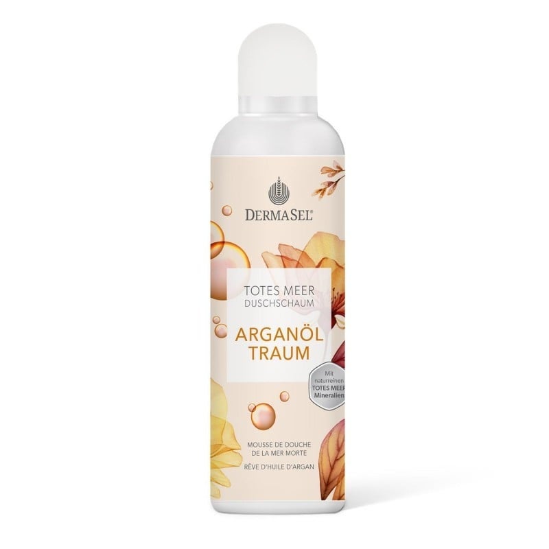 Der DermaSel® Duschschaum Arganöl Traum verwöhnt die Haut mit einem Hauch von Luxus. Die luftig-leichte, moussige Textur reinigt sanft und pflegt zugleich – für ein unvergleichlich glattes und geschmeidiges Hautgefühl. Die Formel mit wertvollem Arganöl und dem „Weissen Gold“ naturreiner Totes-Meer-Mineralien versorgt die Haut mit intensiver Feuchtigkeit und wichtigen Nährstoffen. Gleichzeitig wird die natürliche Hautbarriere gestärkt, und die Haut fühlt sich nach dem Duschen weich, gepflegt und rundum verwöhnt an. Der zarte, harmonische Duft rundet das Duscherlebnis ab und hinterlässt ein Gefühl von Reinheit und Entspannung.