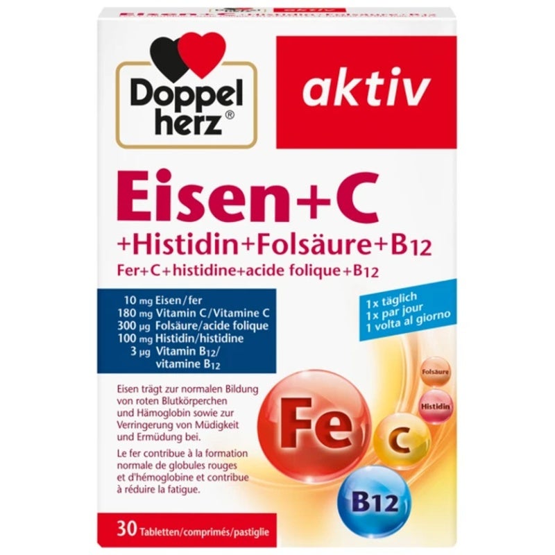 Doppelherz Aktiv Eisen + C vereint essenzielle Mikronährstoffe, die gezielt zur normalen Blutbildung, zur Verringerung von Müdigkeit und zur Unterstützung des Immunsystems beitragen. Eisen ist wichtig für die Bildung roter Blutkörperchen und die Sauerstoffversorgung des Körpers, während Vitamin C die Eisenaufnahme im Darm erhöht und zugleich zur normalen Funktion des Immunsystems beiträgt. Ergänzend sorgt Folsäure für eine gesunde Blutbildung und unterstützt die Zellteilung, während Vitamin B12 den Energiestoffwechsel fördert und ebenfalls eine Rolle beim Immunschutz spielt. Mit Histidin ist zudem eine Aminosäure enthalten, die an verschiedenen Stoffwechselprozessen beteiligt ist.