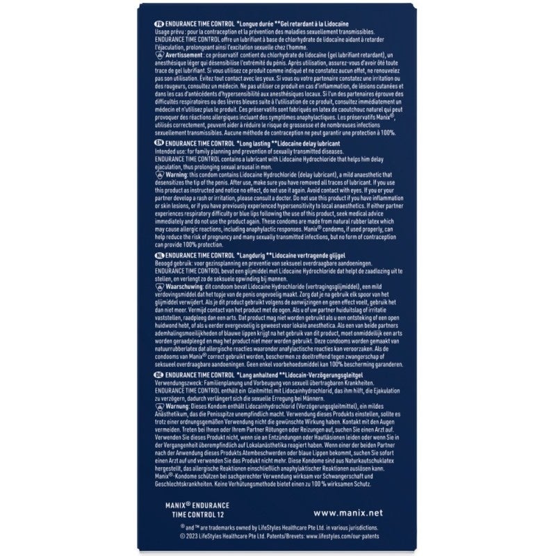 Für längere Intensiv-Momente! Aktverlängernde, feuchte Kondome Endurance Time Control von MANIX innen mit Verzögerungsgel Lidocain beschichtet. Kann die Empfindlichkeit reduzieren und somit die Erektionsdauer verlängern für ein ausdauerndes Liebesspiel. Zylindrische Form mit Reservoir. 12 Stück. Nennbreite 53 mm. Naturkautschuklatex.