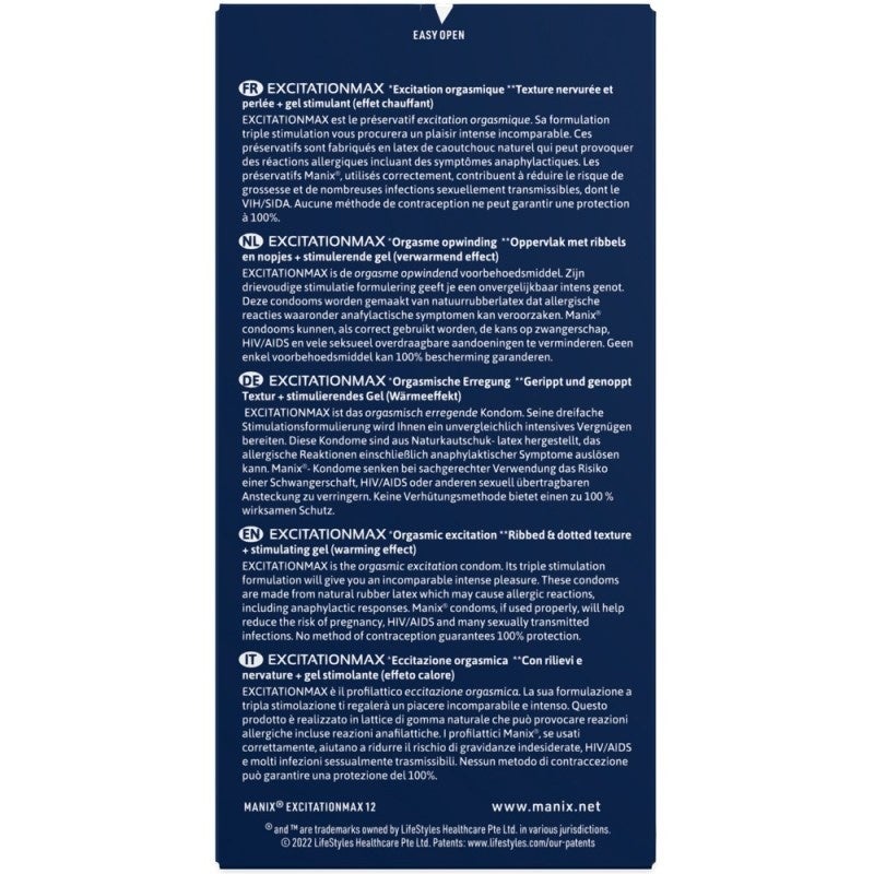 Kondome mit Orgasmus-Booster! Stimulierende Kondome Excitation Max von MANIX mit Noppen und Rillen sowie wärmendem Gleitgel befeuchtet. Dazu extra konturiert für optimale Passform, mit natürlicher Farbe und mit Reservoir. 12 Stück. Nennbreite 52 mm. Naturkautschuklatex.