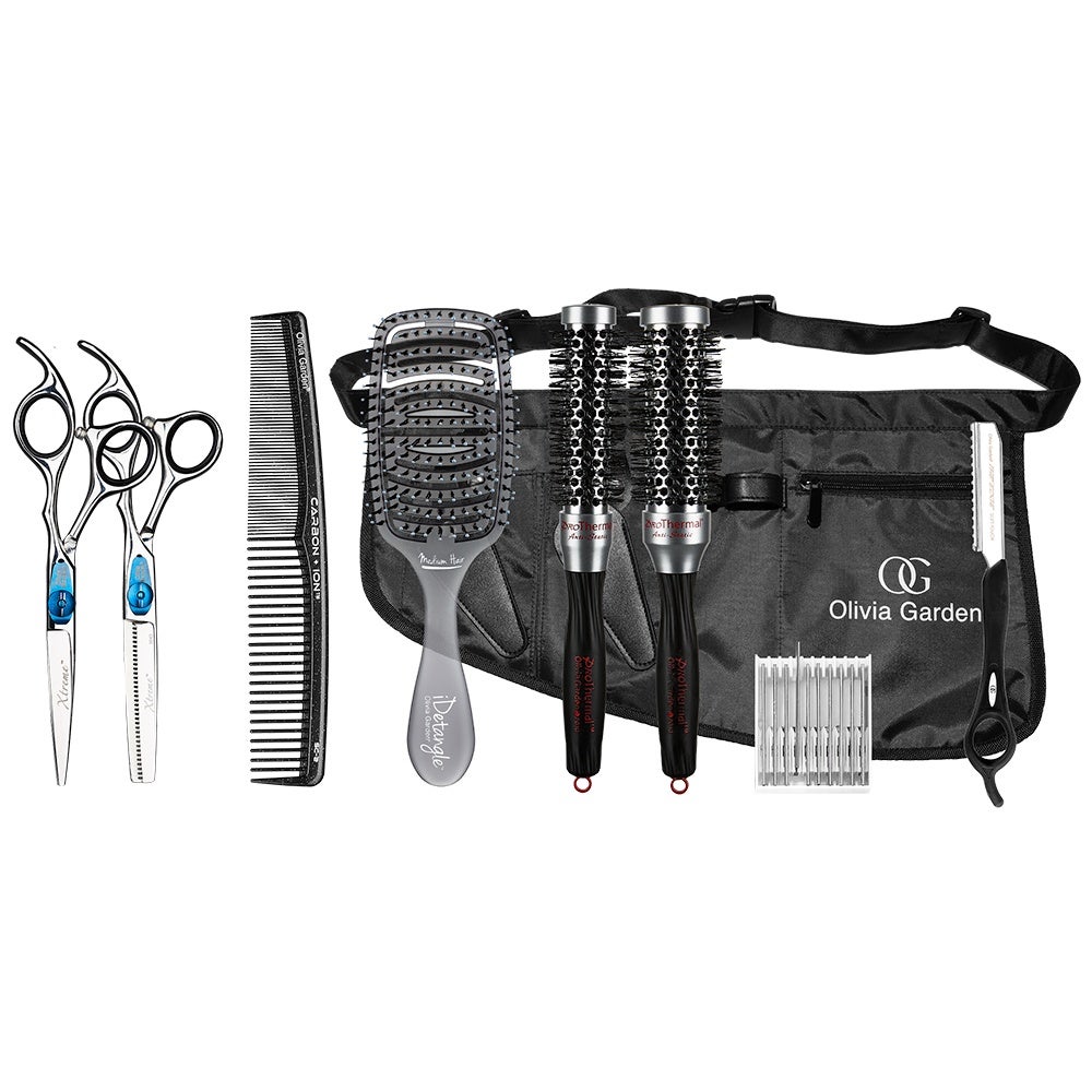 2 Rundbürsten ProThermal (25 und 33 mm), Carbon + Ion Haarschneidekamm SC-2, Frisiermesser "The Edge" + 10 Ersatzklingen, Entwirrungsbürste iDetangle für normales Haar und ein Werkzeuggürtel.