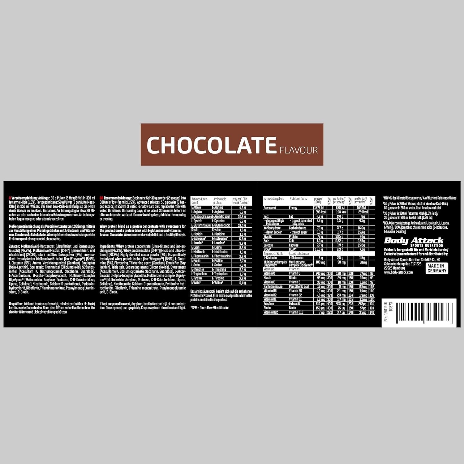Chocolate: Molkeneiweiß-Konzentrat (ultra- filtriert und ionenausgetauscht) (47,2%), Molkeneiweiß-Isolat (CFM*) (mikrofiltriert und ultrafiltriert) (28,3%), stark entöltes Kakaopulver (7%), enzymatisch hydrolysiertes Molkeneiweiß-Isolat (Iso-Wheypep®) (5,4%), L-Glutamin (5%), Aroma, Verdickungsmittel (Xanthan), Emulgator (Soja-Lecithin), Speisesalz, Trennmittel (Siliciumdioxid), Süßungsmittel (Acesulfam K, Natriumcyclamat, Saccharin, Sucralose), L-Ascorbinsäure, D-alpha-Tocopherylacetat, Multienzymkomplex DigeZyme® (Maltodextrin, Amylase, Protease, ß-D-Galactosidase, Lipase, Cellulase), Nicotinamid, Calcium-D-pantothenat, Pyridoxinhydrochlorid, Riboflavin, Thiaminmononitrat, Pteroylmonoglutaminsäure, D-Biotin.