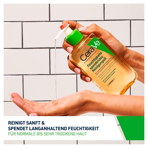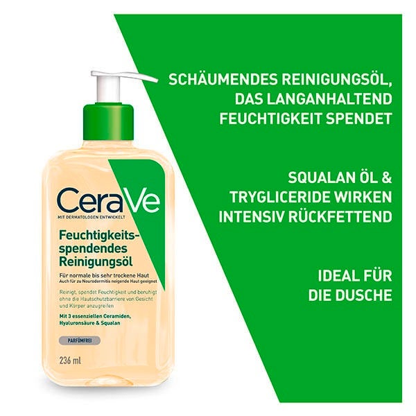 Das Feuchtigkeitsspendende Reinigungsöl von CeraVe wurde in Zusammenarbeit mit Dermatologen entwickelt. Die einzigartige, schäumende Formel reinigt die Haut sanft und wirkt beruhigend. Make-up wird schonend entfernt, ohne die Haut zu reizen. Das Reinigungsöl mit Ceramiden, Squalan und Triglyceriden versorgt die Haut bereits während der Reinigung mit Feuchtigkeit und beugt Austrocknung vor – für eine gestärkte Hautschutzbarriere. Das CeraVe Feuchtigkeitsspendende Reinigungsöl ist auch für zu Allergien neigende Hauttypen, sehr trockene Haut, zu Neurodermitis neigende Haut sowie empfindliche Babyhaut geeignet, da die Formel ohne Parabene und Parfum auskommt. Anwendung: Das CeraVe Feuchtigkeitsspendende Reinigungsöl morgens und/oder abends auf die Haut auftragen. Gesicht und/oder Körper vorher anfeuchten. Im Anschluss den Schaum gründlich abwaschen. Hinweis: Den direkten Kontakt mit den Augen vermeiden.
