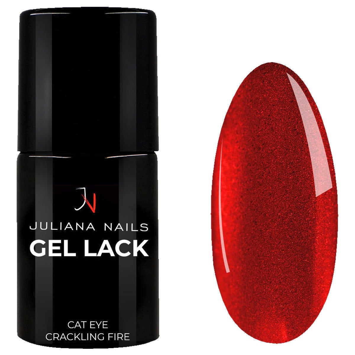 Mit unserem Gel Lack (= UV-Lack) kannst du dich auf bis zu 5 Wochen perfekte Nägel freuen. Ohne Absplittern, ohne Zerkratzen und ohne lästige Abdrücke auf frisch lackierten Nägeln! Er ist einfach wie Nagellack aufzutragen und härtet blitzschnell in nur 60 Sekunden unter UV/LED-Licht. Unser Gel Lack Cat Eye Crackling Fire ist ein Dunkelrot mit hauchzarten Schimmerpigmenten in strahlendem Rot. Die Cat Eye Gel Lacke enthalten metallische Pigmente, die auf einen Magneten reagieren. Dadurch lassen sich schnell und einfach tolle Muster auf deine Nägel zaubern.