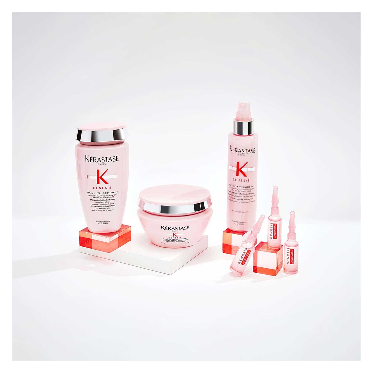 Bain Hydra-Fortifiant Genesis von Kérastase ist ein kräftigendes Shampoo gegen Haarverlust von der Haarwurzel und durch Haarbruch. Es reinigt und kräftigt die Haarfaser sanft, senkt das Haarverlustrisiko. Diese ultrafeine Formel ist ideal geeignet für normales, feines oder fettiges Haar und entfernt gründlich Talg und Schmutz der Kopfhaut und Haarfaser. Die sanfte Reinigungswirkung beruhigt das Haar und versorgt es vom Ansatz bis in die Spitzen mit Feuchtigkeit. Für ein schwereloses Gefühl. Die Formel enthält eine wirkungsvolle Kombination von Edelweiss-Zellen und Ingwerwurzel. Sie kräftigt die Haarfaser und sorgt für umfassende Widerstandskraft, mit der dem Haarverlustrisiko aufgrund von Haarbruch entgegengewirkt wird. Das Haar wird auf die weitere Pflege vorbereitet, gestärkt und sieht sowohl voller als auch gesünder aus.