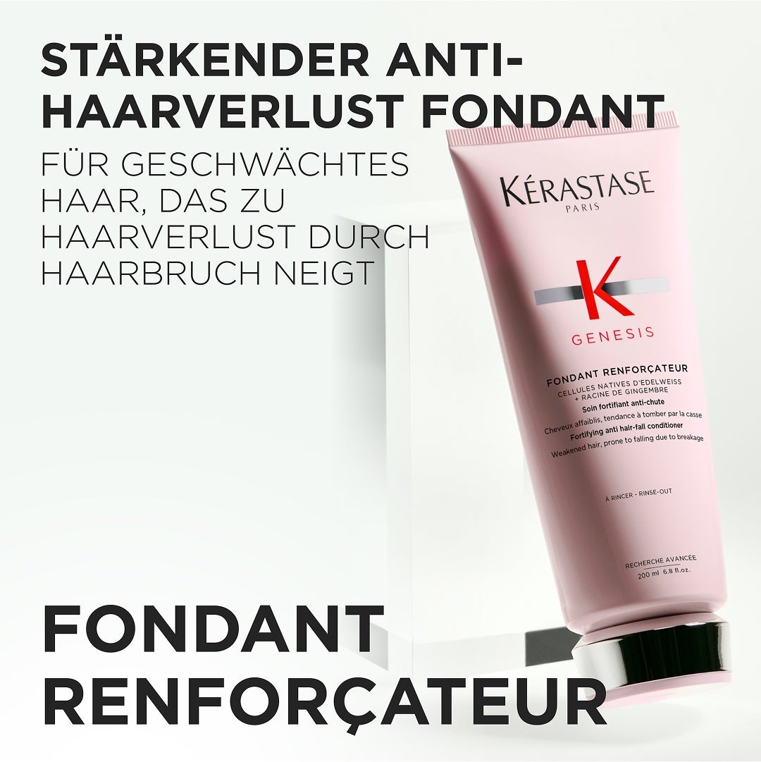 Fondant Renforçateur Genesis von Kérastase ist ein kräftigender Conditioner gegen Haarverlust durch Haarbruch. Diese cremige Formel wirkt Haarbruch entgegen und sorgt für ein schwereloses Finish. Sie hilft beim Wiederaufbau der Haarfaser und stärkt ihre natürliche Widerstandsfähigkeit, um das Haarverlustrisiko aufgrund von Haarbruch zu senken. Die Formel enthält eine wirkungsvolle Kombination von Edelweiss-Zellen und Ingwerwurzel, sie glättet und stärkt die Haarfaser und macht sie geschmeidig. Gleichzeitig wird das Haar intensiv gepflegt, ohne es dabei zu beschweren. Das Haar ist gleichmässig, glänzend und gestärkt.
