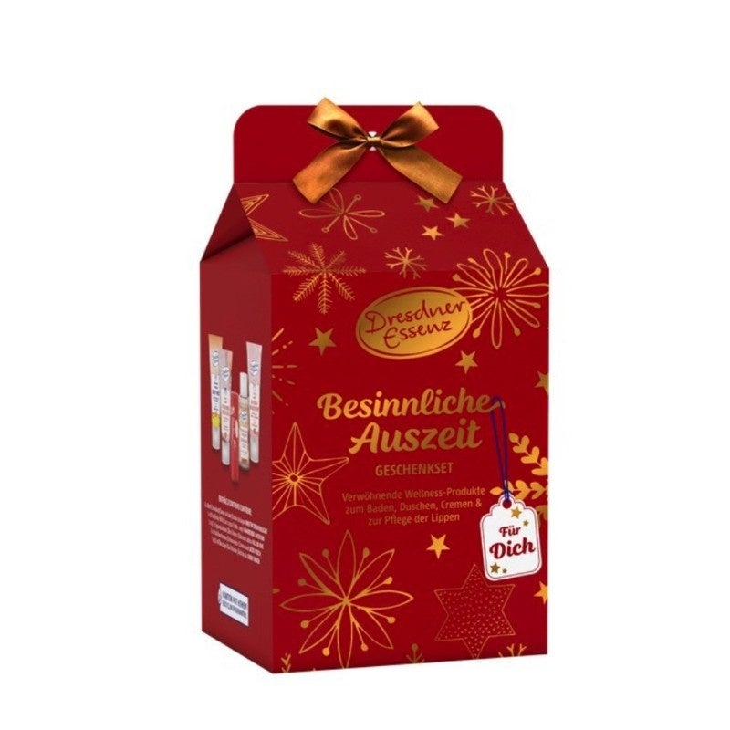 chenke dir oder deinen Liebsten wertvolle Auszeiten mit dem Besinnliche Auszeit Geschenkset von Dresdner Essenz. Dieses sorgfältig zusammengestellte Set kombiniert wohltuende Bade- und Pflegeprodukte mit aromatischen Düften, die Körper und Geist in Einklang bringen. Die harmonische Kombination aus natürlichen Inhaltsstoffen wie ätherischen Ölen, pflanzlichen Extrakten und pflegenden Ölen vermittelt Gelassenheit, beruhigt die Sinne und lässt dich im hektischen Alltag zur Ruhe kommen.