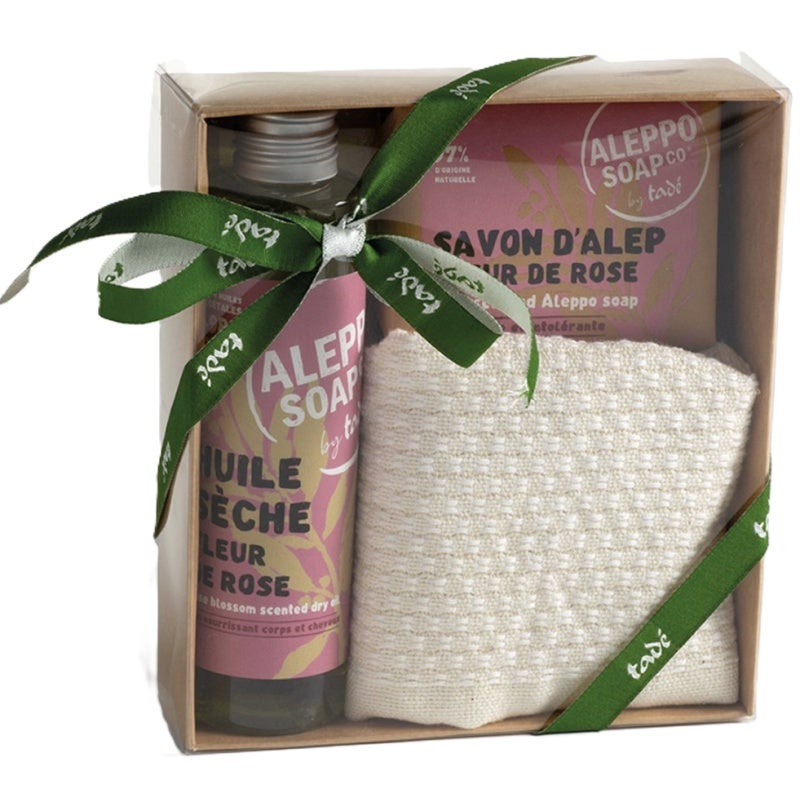 • Belebendes Trockenöl, authentische Aleppo-Seife und Bio-Baumwolltuch