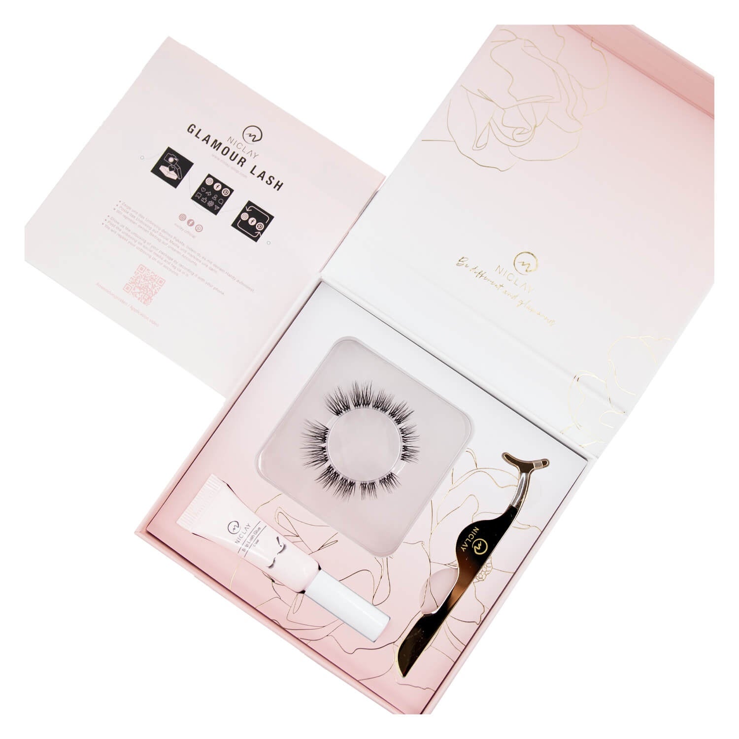 Mit dem Applikator werden die Glamour Lashes einzeln aus der Verpackung entnommen. Im Anschluss wird der Kleber auf die Oberseite des Lash Streifens aufgetragen. Warte wenige Sekunden bis der Kleber transparent wird. Appliziere im Anschluss die Glamour Lashes von unten - ziehe dabei dein oberes Lid leicht nach oben. WICHTIG: Die Glamour Lashes 1-2 mm vom Lidrand entfernt anbringen.
