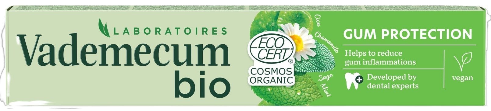 Die Vademecum Gum Protection Bio Zahnpasta kombiniert die Kraft ausgewählter Pflanzen mit moderner Wissenschaft, um Zahnfleisch und Zähne umfassend zu schützen. Die bio-zertifizierte Formel wurde speziell entwickelt, um gelegentliche Zahnfleischentzündungen zu reduzieren, das Zahnfleisch zu stärken sowie Karies und Plaquebildung vorzubeugen. Die Zahnpasta ist COSMOS ORGANIC zertifiziert durch Ecocert Greenlife und enthält den von Zahnärzten empfohlenen Fluoridgehalt von 1450 ppm, der effektiv vor Karies schützt. Die vegane Rezeptur besteht zu 99 % aus Inhaltsstoffen natürlichen Ursprungs und nutzt bewährte Pflanzenextrakte. Centella Asiatica (Cica) stärkt das Zahnfleisch, während Salbei zum antibakteriellen Schutz beiträgt. Zusätzlich hilft Kamille, Entzündungen zu reduzieren und Minze sorgt für ein angenehm frisches Mundgefühl.