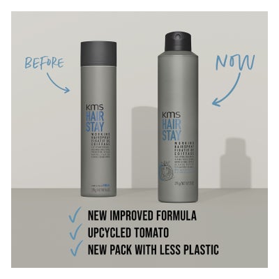 Das KMS HairStay Working Hairspray bietet bis zu 72 Stunden lang aufbaubaren Halt und eliminiert Frizz und fliegende Haare um bis zu 90 %. Die schnell trocknende Formel sorgt für ein natürliches Finish, ohne zu kleben, und lässt sich leicht ausbürsten und nacharbeiten, ohne zu schuppen. Die Formel mit upgecycelter Tomate, die als starkes Antioxidans bekannt ist, schützt vor UV- und Umwelteinflüssen und bietet Hitzeschutz bis zu 230°C/446°F für das Styling mit heissen Geräten.