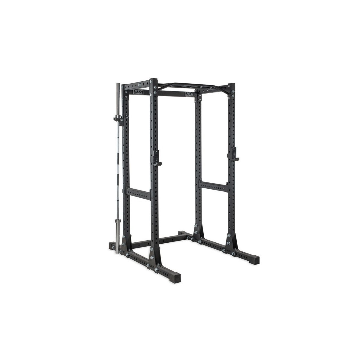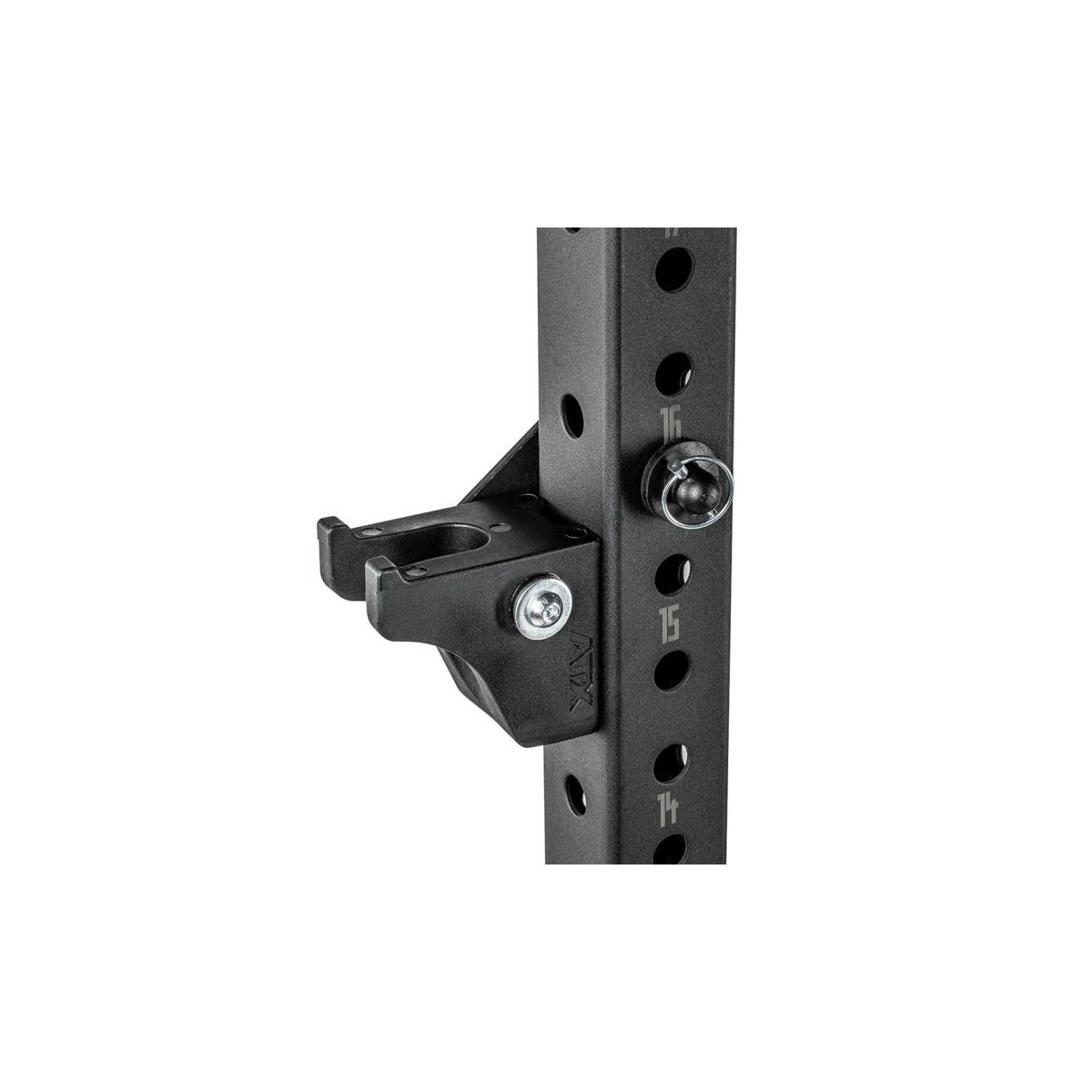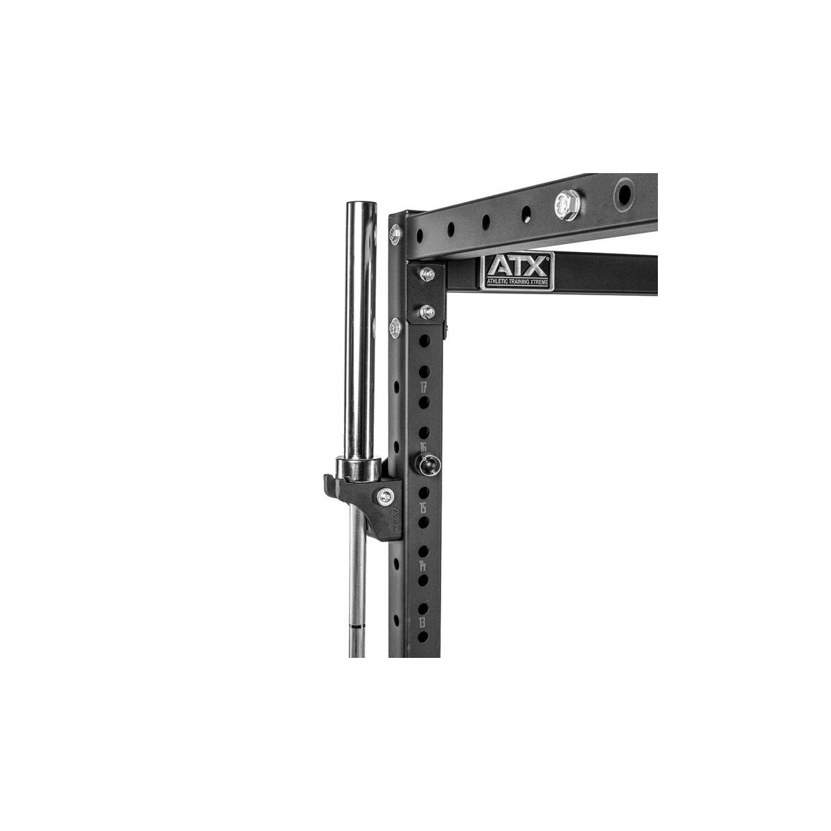 dass die Hantelstange einfach seitlich eingehangen wird, und nicht von oben in die Halterung eingeführt werden muss - was zusätzliche Deckenhöhe vorraussetzt, welche jedoch oftmals nicht vorhanden ist. Ein weiterer Vorteil ist das schnelle und individuelle - zum Teil allseitige Positionieren der Halterung an ATX® Rig & Rack-Pfosten der Serien 500, 600, 700, 800