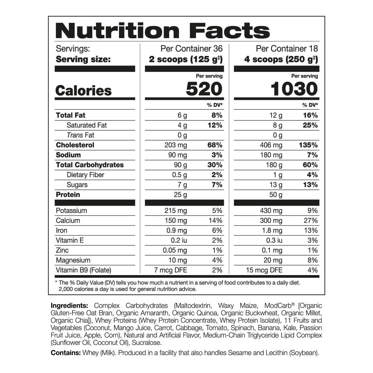 Mit satten 50g Eiweiss pro Portion, einem ausgewogenen Verhältnis von 3,5:1 zwischen Kohlenhydraten und Eiweiss und einer vollen Portion Obst und Gemüse ist es der Superheld unter den Weight Gainern für alle, die ohne Zuckerspitzen zunehmen möchten.