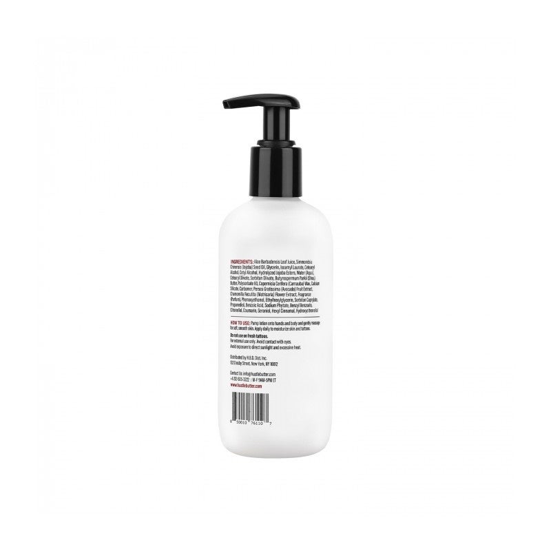 Hustle Butter Daily Lotion ist die Antwort auf Ihre Gebete für trockene Haut. Diese Lotion mit natürlichen, veganen und tierversuchsfreien Inhaltsstoffen verjüngt nicht nur Ihr Kunstwerk, sondern hinterlässt auch ein weiches und seidig-glattes Hautgefühl. Mit Inhaltsstoffen wie Sheabutter, Aloe und Jojoba-Samenöl sorgt unsere Lotion dafür, dass Ihre Haut und Ihre Kunstwerke ein Leben lang schön bleiben. Verwenden Sie die Lotion am ganzen Körper - ob mit oder ohne Tattoos - für eine feuchtigkeitsspendende, strahlende Haut. Und mit einer so gepflegten Haut kommen Ihre Tattoos erst richtig zur Geltung. Niemand will rissige Haut oder stumpfe Tattoos. Vertrauen Sie uns - wenn Sie einmal mit unserer Lotion angefangen haben, werden Sie immer wieder auf sie zurückkommen.