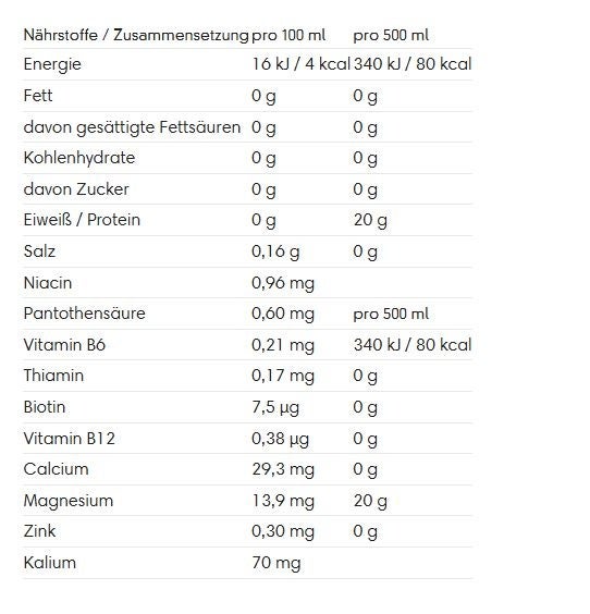 Nat. Mineralwasser, Säuerungsmittel (Citronensäure), Säureregulator (Trinatriumcitrat), Trikaliumcitrat, Calciumlactat, Magnesiumcarbonat, Süßungsmittel (Sucralose, Acesulfam K), Stabilisatoren (Gummiarabicum, Glycerinester aus Wurzelharz), Aroma, Vitaminmischung (Niacin, Pantothensäure, Vitamin B6, Thiamin, Biotin, Vitamin B12), Zinkgluconat, Farbstoff (Azorubin).