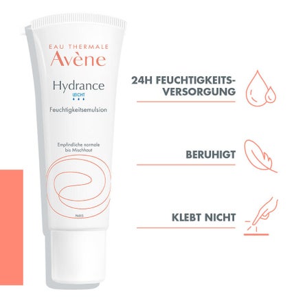 Die Hydrance Feuchtigkeitsemulsion füllt die Haut mit Avène Thermalwasser auf, für eine weiche und mit Feuchtigeit versorgte Haut für 24 Stunden. Die feuchtigkeitsspendende Emulsion ist besonders für feuchtigkeitsarme, empfindliche normale bis Mischhaut, zu empfehlen. Sie klebt nicht und macht die Haut den ganzen Tag über geschmeidig und frisch. Auch mit UV-Schutz SPF 30 oder als getönte BB-Version erhältlich.